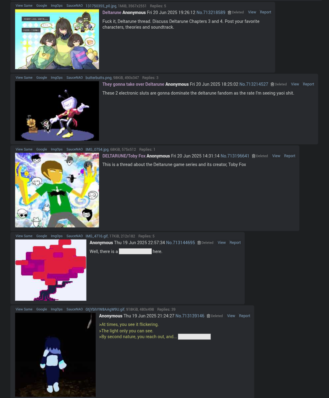 >>737289026It's been like this since the Undertale days, difference is there weren't pedophile ecelebs like shayy virtue signaling "THE HUMANS ARE FUCKING NONBINARY, RESPECT THEIR PRONOUNS" back at the height of tumblr obsession and everyone was generally on the same page that the characters were open to interpretation.It was when Chapter 1 with Kris who's very clearly not as interpretable rolled in that the mindset got called into question, especially since this is when all the other types of tumblr weirdness started fading out in favor of pronouns and labels, which eventually gave a perfect opening for this new narrative.It's not even that Toby is scared of backlash if he says anything, he's just ultimate autismo about not letting anyone know anything about the humans until we're deemed "ready" for a sacred droplet of detail. And whether the humans are boys or girls 'neath the ambiguity isn't one of those details that will ever leave his brain.