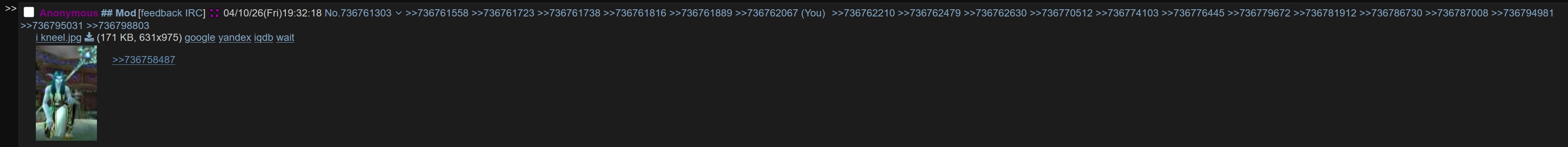 >>737313221meant for >>737312974however you are a schizo as well for thinking retailtroons and their daily wow porndump threads are better than pserverfags