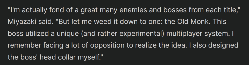 >>737332141>Bloodborne's core idea was apparently brought to From by SCEJ out of a desire to work with MiyazakiSnoy fanfiction. It's born out of this specific video:https://youtu.be/oiGPTI06fn8?t=177Even in english it's quite obvious that the "idea" was simply working together, this "desire of working with Miyazaki", but in japanese it's beyond any doubt. Miyazaki talked at length about all of the core inspirations behind Bloodborne, it wasn't anything handed to him.Didn't read the rest.