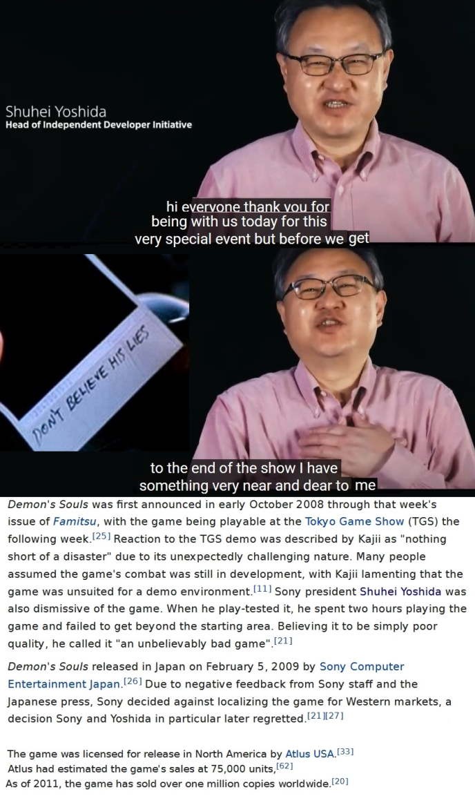 >>737331689>enemies have fixed placements: this is the result of design choices that favour giving you a sense of accomplishment, learning by dying. In other words, even if you die and lose all your souls (making you unable to level up), you can try again because you remember where the enemies are placed.>DeS three main points were "The world of dark fantasy", "Swordfighting Action RPG", "Exploration, discovery, strong enemies, strategy">In Demon’s Souls, they tried to implement some features (World Tendency, Soul form which cuts your health in half) in a kind of experimental way, not being sure whether or not it would be popular, but did it anyways so that could see how people reacted>From a marketing perspective, Demon’s Souls is a project that should have never been initiated>Shuhei Yoshida, a 30-plus-year Sony veteran and renowned software developer, thinks DeS is crap based on an early build that he's shown, and drops all Sony support for it>完成間近の段階でDemon’s Soulsを2時間ほどプレーしたが、2時間後にもプレーを開始した時と全く同じ場所に立ったままだった。>「これは駄目だ。信じられないほど酷いゲームだ」と感じて、プレーを止めてしまったよ。>I played an almost finalized version of the game for about 2 hours, but 2 hours after having started playing I was still standing there at the same location.>"This is terrible. It's an incredibly awful game.", I thought to myself, and stopped playing>Sony Japan localization specialist Yeonkyung Kim has admitted that the company’s decision not to publish cult dungeon crawl Demon’s Souls worldwide was an error>From Software operates on, basically, the feeling of “we make games that we want to make”,>Shirogumi developed the Demon's Souls cinematics/FMVs