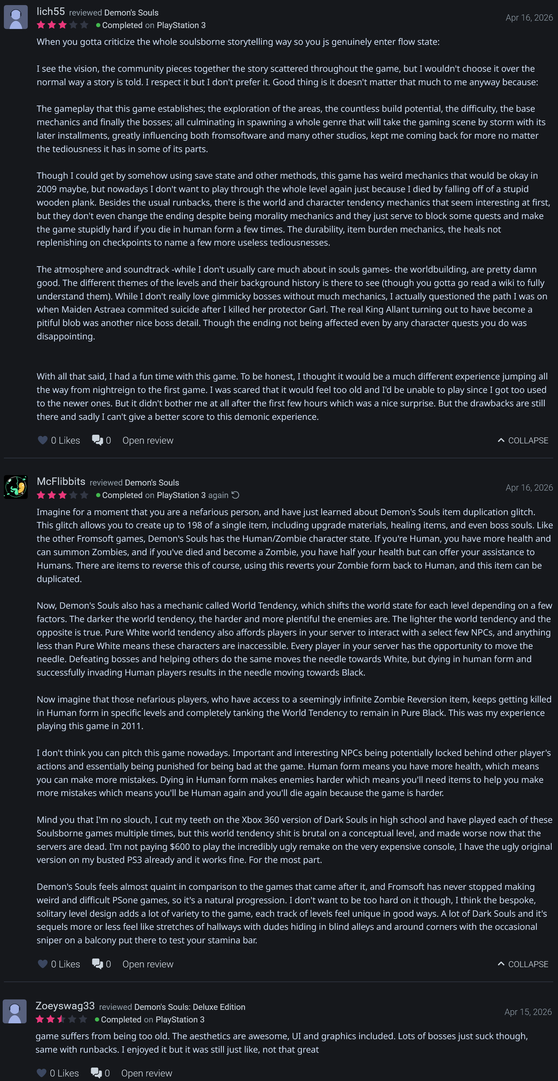 I love how replayable Demon's Souls is. I've played through Dark Souls 1, 2, and 3 several times, but I've beaten Demon's Souls over a dozen times because you can complete the game in under a few hours once you know what you're doing and it's just a really comfy game. I've only beaten Elden Ring once.