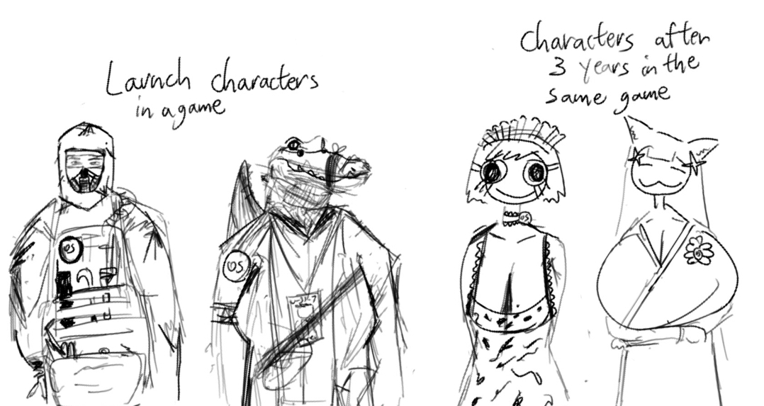 not characters but you can see it in MMOs where cash shop outfits go from being modest and believable for the games world with the occasional wacky outlier to just straight up random bullshit that clashes hard with the games aesthetics