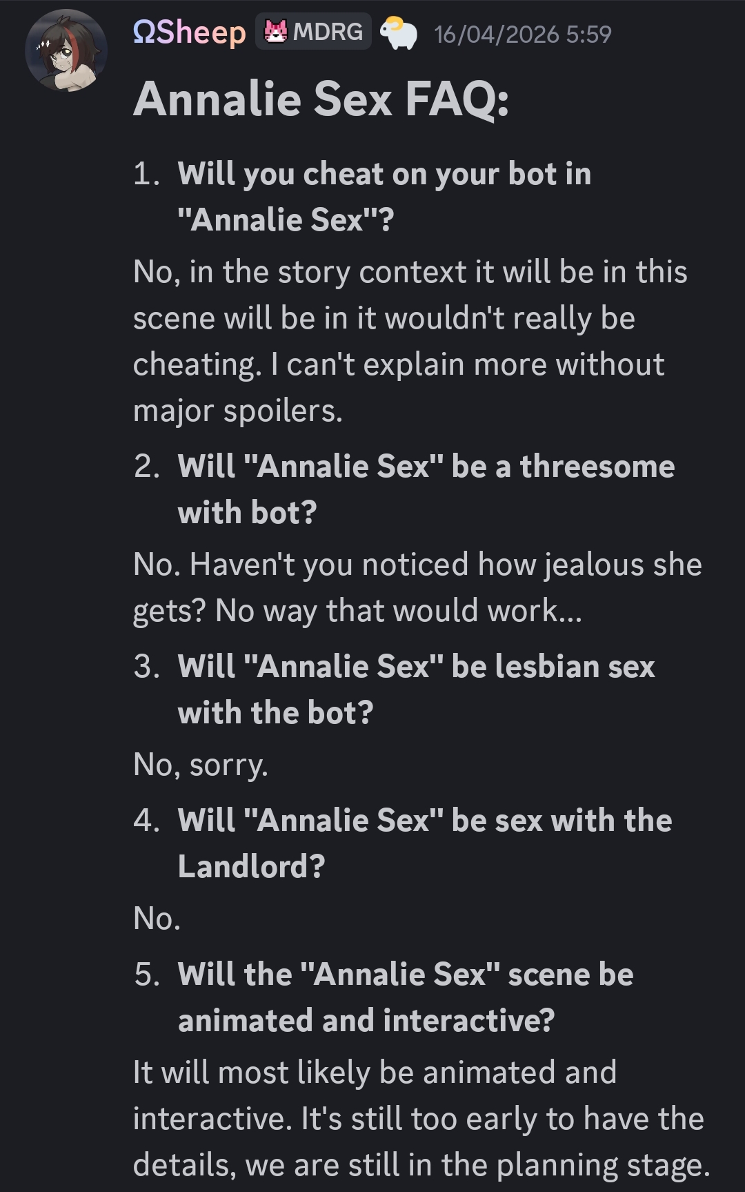 >>737355001It really confuses me how people consider this hamfited romantic plot great. BaD should just be a fun exerience where you can emulate being a college chad who fucks everyone. Yes the women aren't cardboard cutouts which is great, but actually forming emotional attachments to them, like some people do here, is truly baffling.To me, the story in these games is for one purpose and one purpose only - to heighten the eroticism, power fantasy, taboo flirtation and flattering of its target audience. Everything is secondary to that. The cunts who speculate about plot threads on F95, I mean, is there literally nothing better in your life? Go to your local library and pick anything at random and you'll have a better plot experience.