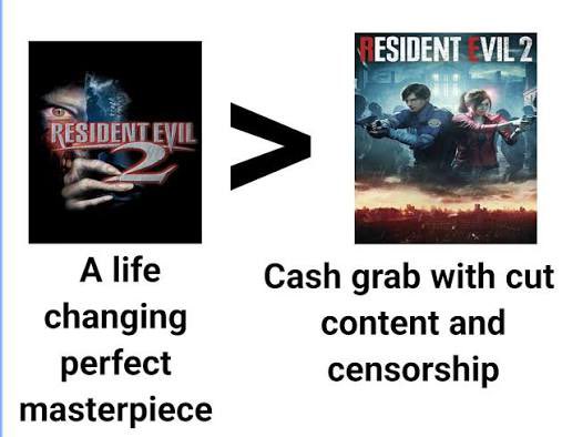 As a fan of both, I think the worst thing about the Remake was the lack of the A/B Scenario stuff. I mean I get that they kinda just made it into the base game with Mr. X being in all the time and gave Claire the A finale and Leon the B, but it still sucks that it doesn't have any of the "crossplay" features like how if you left certain items on an A run the B run could pick them up and shit.