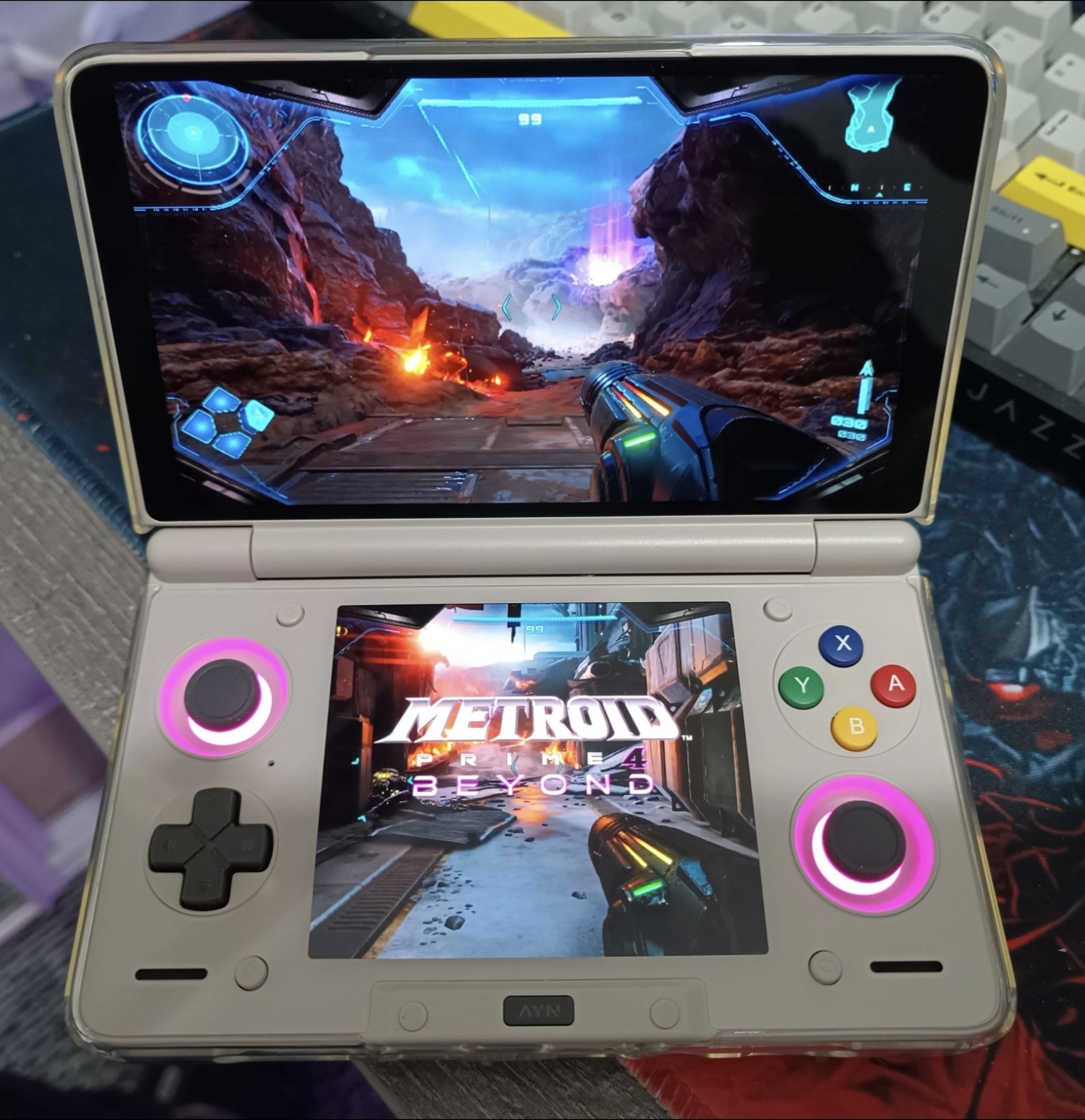 >>737376162>The AYN Thor Dual-Screen Handheld Console is a highly portable Android gaming device that features two AMOLED displays, allowing for a nostalgic experience reminiscent of the Nintendo DS and 3DS.https://www.ayntec.com/products/ayn-thor