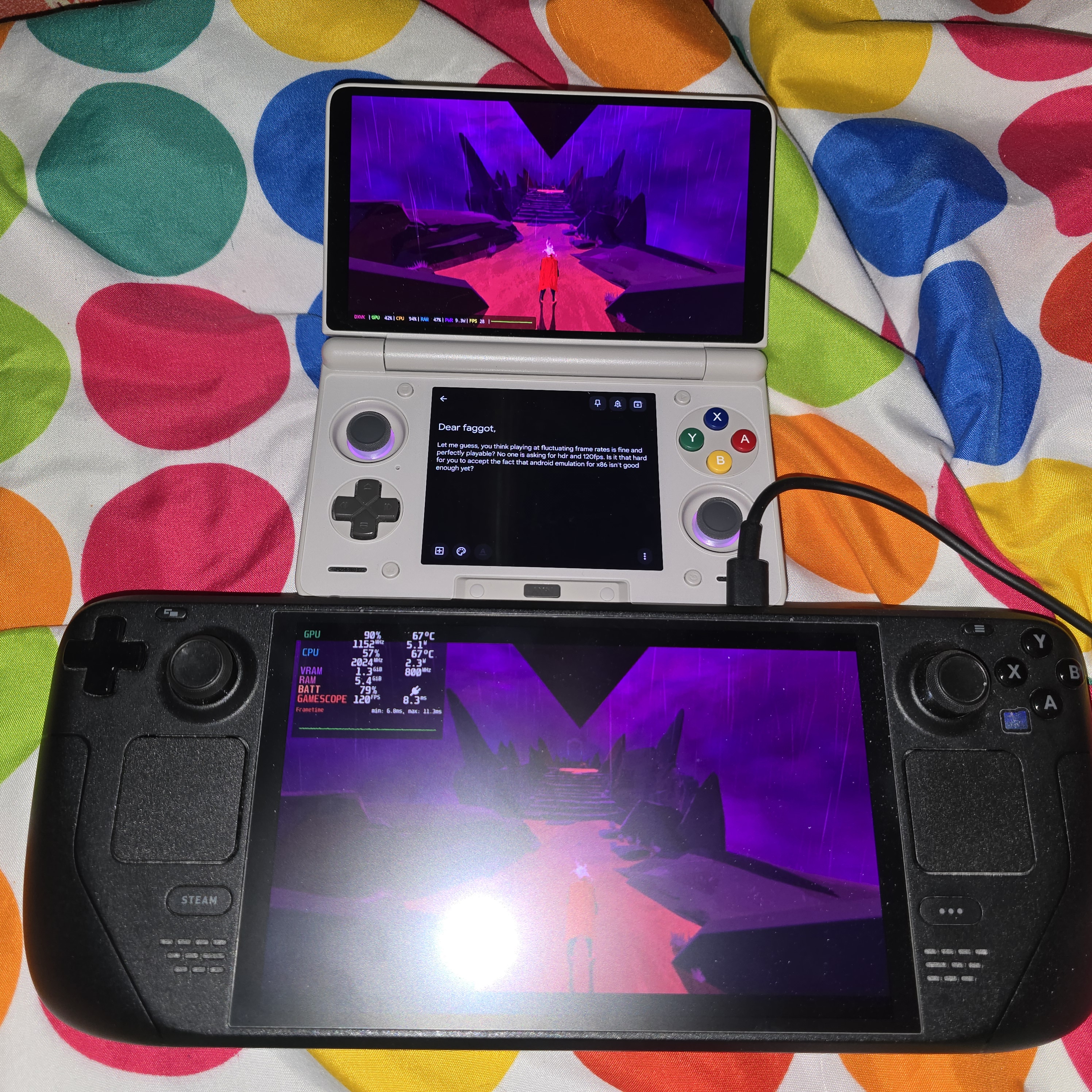 >>737375571>Clamshit >DualshitLol. Kekaroo even. Just get the odin 2 portal or retroon pocket 6, folks. Better yet, an anbernig ayaneo phone controller.>>737385950>Jeetdroidkeks have to lie while using forks of winlator until steamos for arm finally isnt shit.Grim