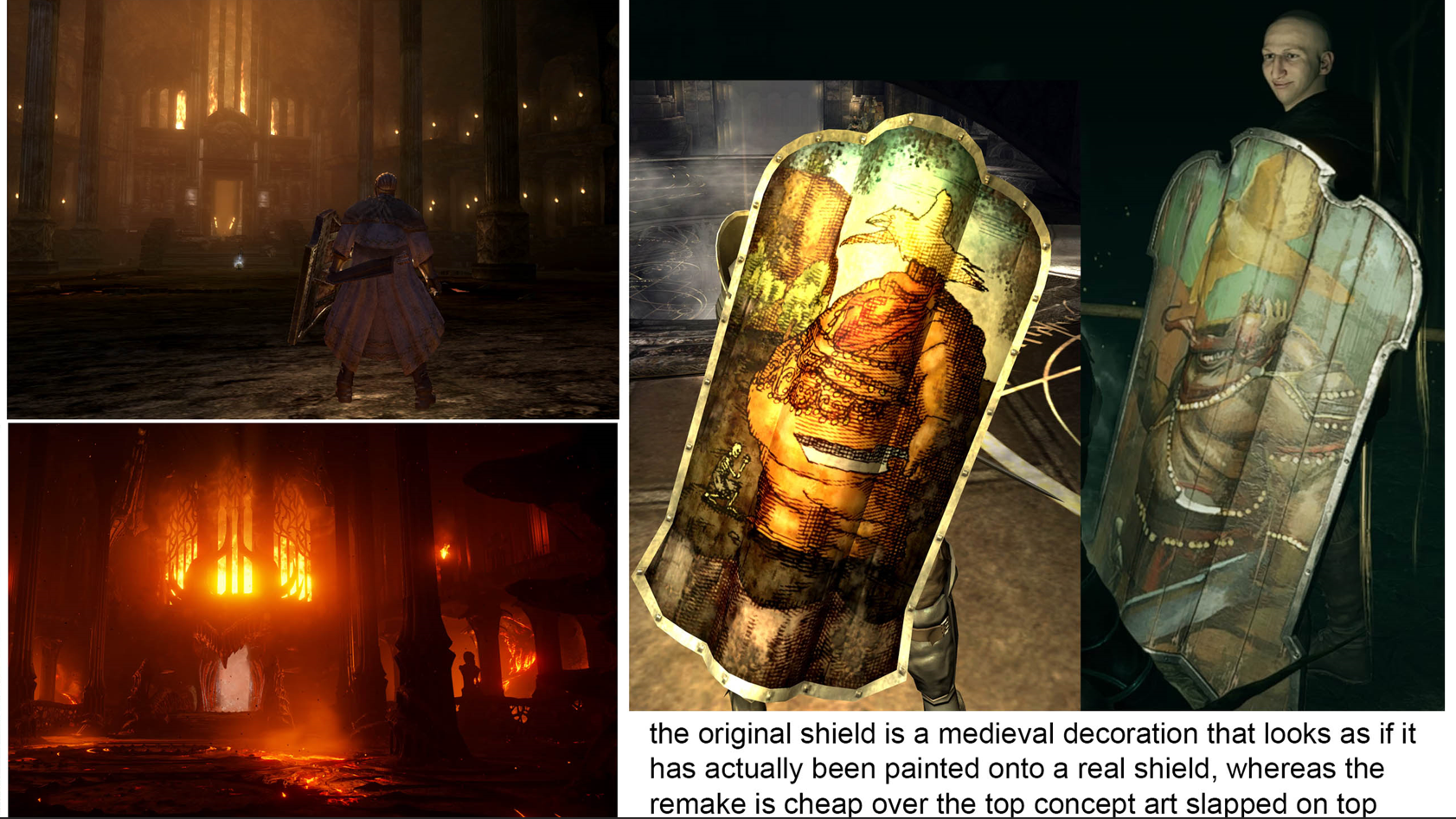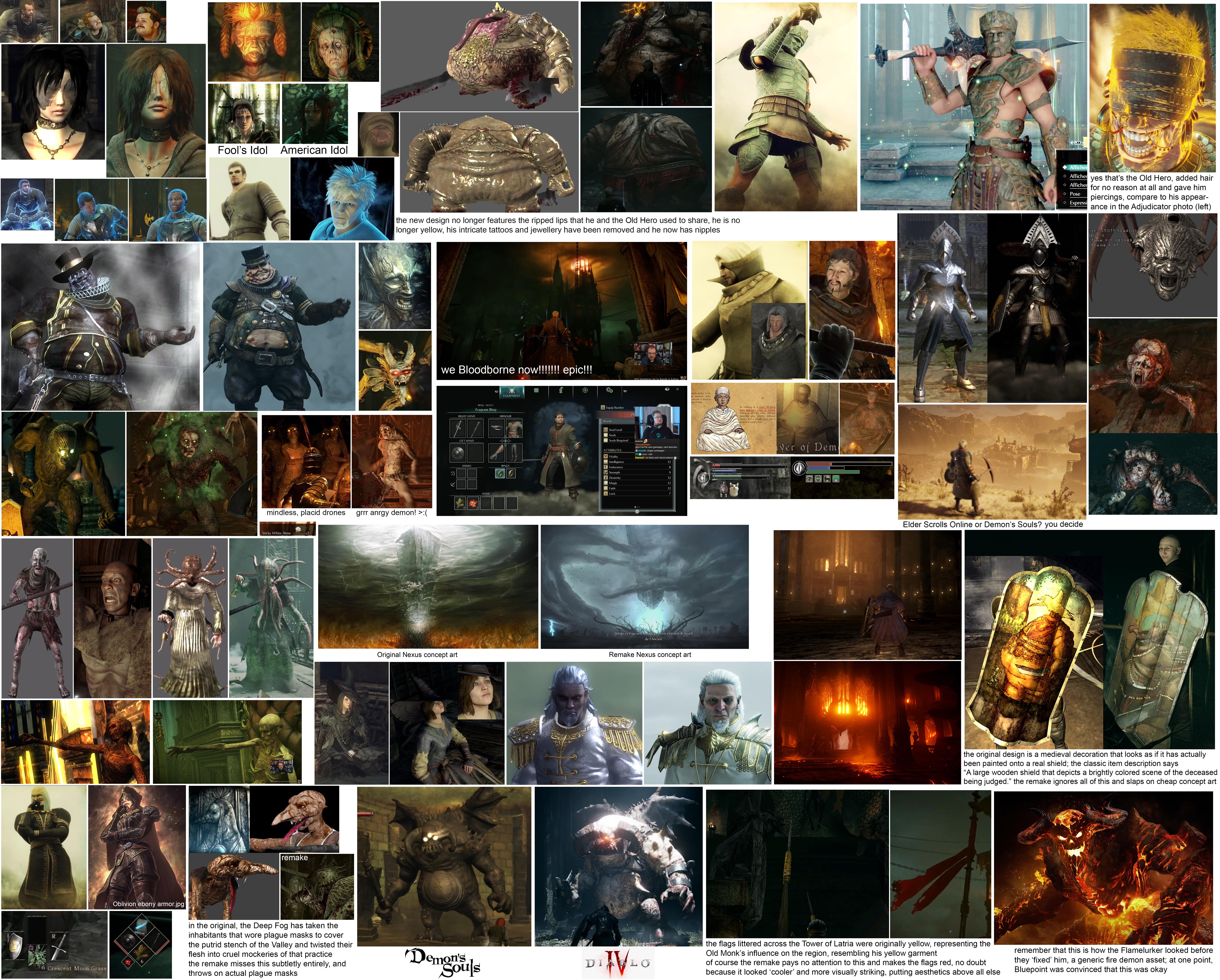 >>737437445Too bad that image doesn't also have some stuff about the butchery of the architecture. The architecture of the original was purposely 11th and 12th century inspired. The armor, weapons, and clothing were purposely 13th and 14th century inspired. It was meant to convey the world had history, and wasn't just static and frozen in vague "Gothic century." Unlike Bluepoint's, "We've reached the year 1557, and all of history has now stopped, everything older than 1557 has been torn down and replaced with what we have developed in the year 1557. Also please ignore that the architecture is now more advanced than the actual armor, arms, and clothing of the characters who are about a century behind now which actually makes no sense."And, Christ, could I rant about changing the Journey to the Nexus to "Boletarian Outpost," in the remake. Apparently Bluepoint is so fucking vapid and unintelligent they didn't realize the Journey to the Nexus doesn't take place in a Boletarian fort, it is a far older structure, as indicated by its architecture, than Boletaria. The reason why the Boletarian soldiers and Vanguard are there is because King Allant traveled through the ruins on his way to wake the Old One. But apparently Bluepoint, being the stupid motherfuckers they are, thought, "Well, there are Boletarian soldiers here, that must mean this was a Boletarian fortress!" And don't even get me started on the fact they don't know what the word outpost means, and an outpost wouldn't be a fucking fully decorated palatial fortress structure. Words have fucking definitions, they don't just mean what you feel they mean because you're too fucking lazy to look them up and your California public education system failed you goddamnit.