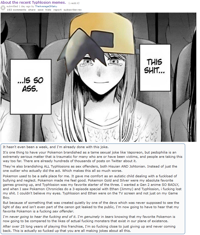 >>737389676It's so funny how the pedo typhlosion memes mindbroken typhlosion fans when it came to light. They were legit on suicide watch back then. Like, look at this.