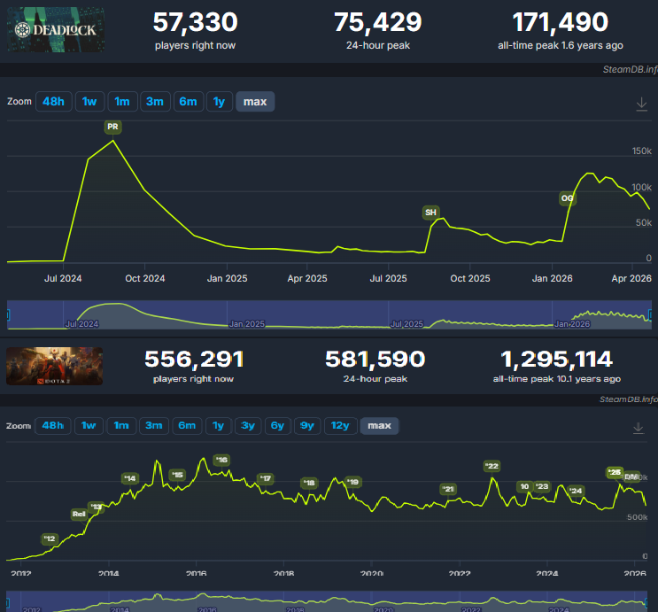 >>737449785why do people even give a shit about steamcharts anymore? nearly every genre is hypersaturated to where people just go through the "two week minecraft phase" but with every game in their library depending on which live service slopfest or 20 year old indie darling like terraria has dropped new content. we don't even have meaningful (or any) player metrics for games that have larger player bases outside of steam, or exist entirely outside of steam (overwatch, league, fortnite, etc)for every game where some doomer claims a game is dying and with zero exceptions, there's always a spike after a massive content drop that sputters out as people churn through it and go play something else because everyone has options now. it's just not useful data unless you're taking all other games into account and comparing things like retention rate over multiple windows or comparing peaks, and even then, it doesn't paint a full picture.>inb4 tf2, dota, cs have better chartsthey also have bots that shuttle loot boxes in and out of the market. there's a monetary incentive for the bots. deadlock has zero monetization at the moment.