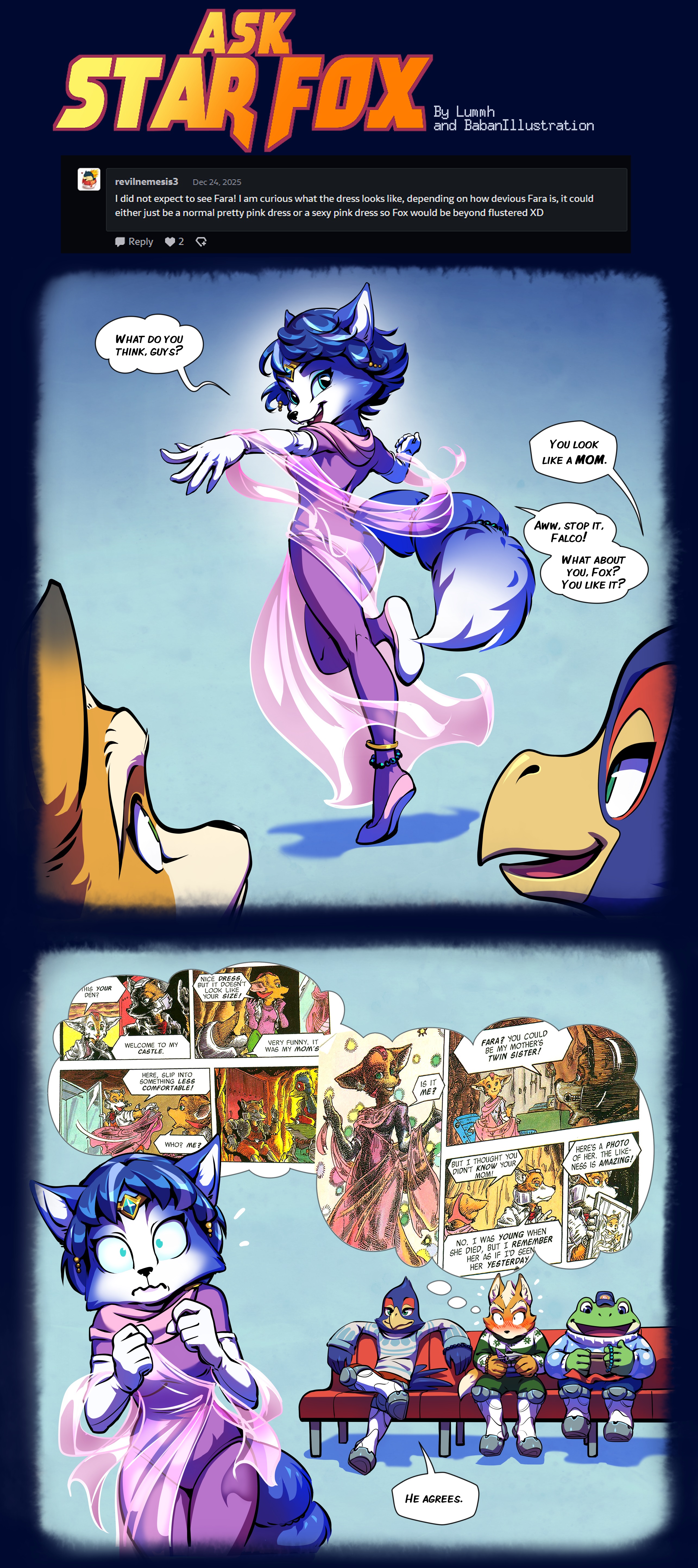 >>737399617>serious answerI want to see a classic rail shooter with no quirky gimmicks and proper controls. I want a brand new adventure with new characters and locations. I don't need a deep story, just a decent narrative with good banter.It would also be great to have a decent multiplayer mode, although it should not come at the cost of the campaign like it did in Assault. I also want a character creator so I can make my own scrimblo for multiplayer. If Nintendo is able to deliver a good classic Star Fox game, then after that I want a new adventure style game. Ideally something brand new, but if they choose to reboot Adventures then I want it to be a hard reboot. Retcon everything but Krystal and just try again. If I could ask for anything, no matter how impossible, then I also really want to have a Star Wolf spinoff game that takes place between 64 and Assault. >Gamer answerI want to see Wolf top Fox.