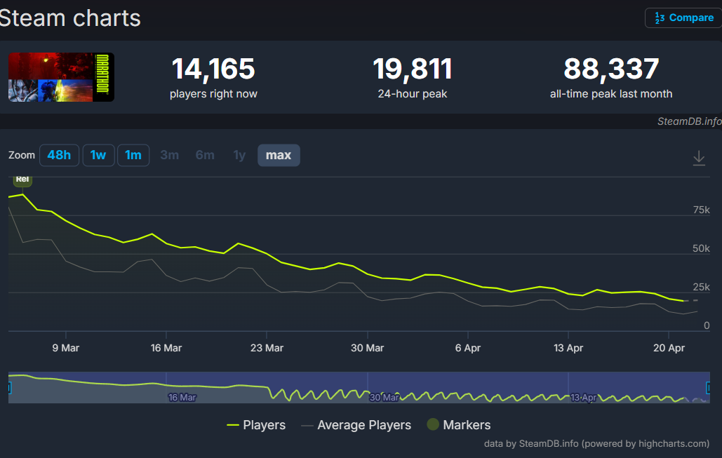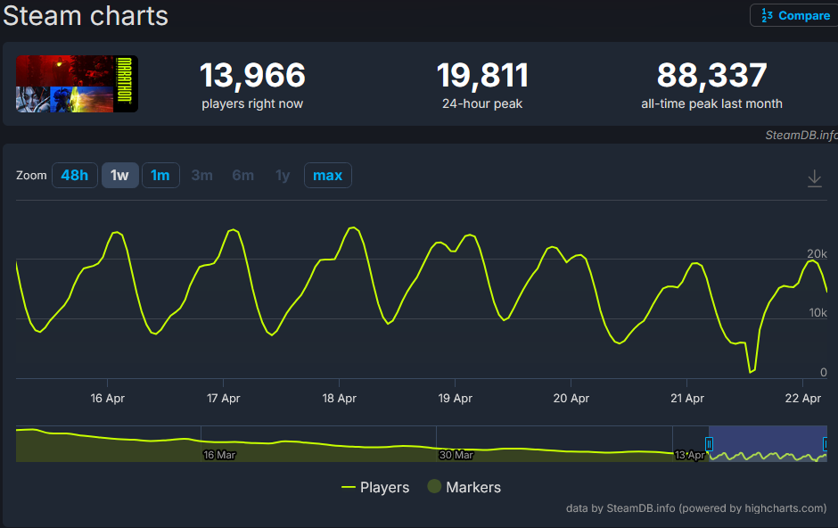 >less than 20k peak players for the second day in a rowgonna have to do better than 6 dollars off, lmao