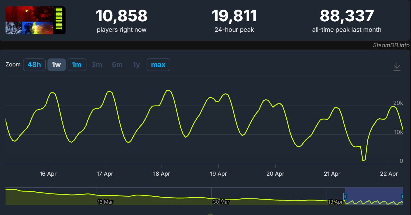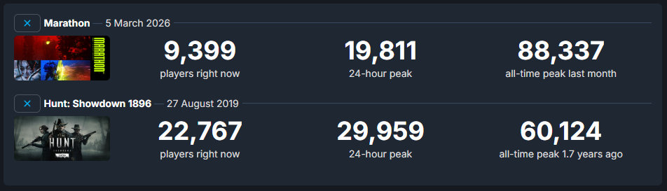 >>737434182respect for the hunt bvllsthe game was always a massive underdog, but their playercount is somehow the inverse of marathon's