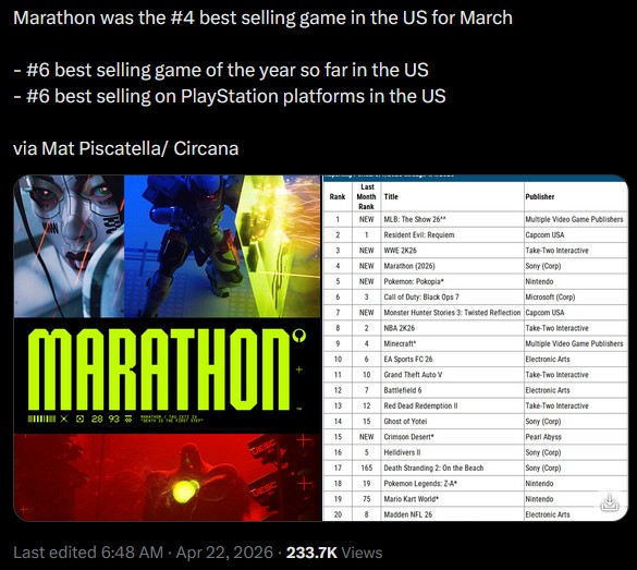 >sony spends 3.6 billion dollars buying bungie and over 200 million developing marathon>shill it as the biggest game ever>pays every single mainstream reviewer site to give it high scores>becomes the 6th best selling game of the ps5 on 2026 so far, only 4 months into the year and naturally the ps5 hasn't got any games this year in the first placethis shit is looking incredibly dire