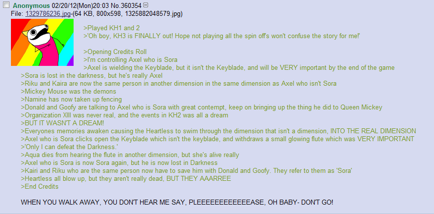 >>737405249>Kingdom Hearts>Disney AdultLOL noDisney Adults don't even play this shit>t:lives with one