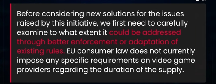 EU just put out a statement in response to Stop Killing games saying that they are seeing if game companies are violating current law instead of needing to pass new laws.This at first sounds good for game companies but actually it's far worse. If the EU decides current laws is the way to go that means all GAAS companies can get sued retroactively for shutting down games in the past.Based EU about to sue Sony for shutting down concord and Ubisoft for the crew