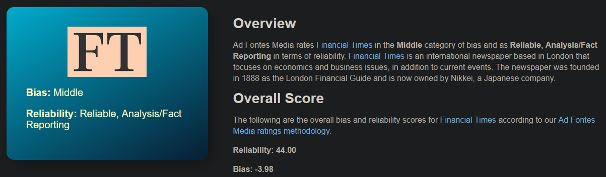 >>737419251They're center leaning center-right and basically every bias-test they go through brings up the fact that they're fairly impartial.https://adfontesmedia.com/financial-times-bias-and-reliability/https://mediabiasfactcheck.com/financial-times/https://www.allsides.com/news-source/financial-times-media-biasIf you have some beef with them you do you, my point in saying that is to state that Gameindustry.biz just reports on the news and doesn't really take sides at all. If you can't grasp that I have no idea why you even want to argue.