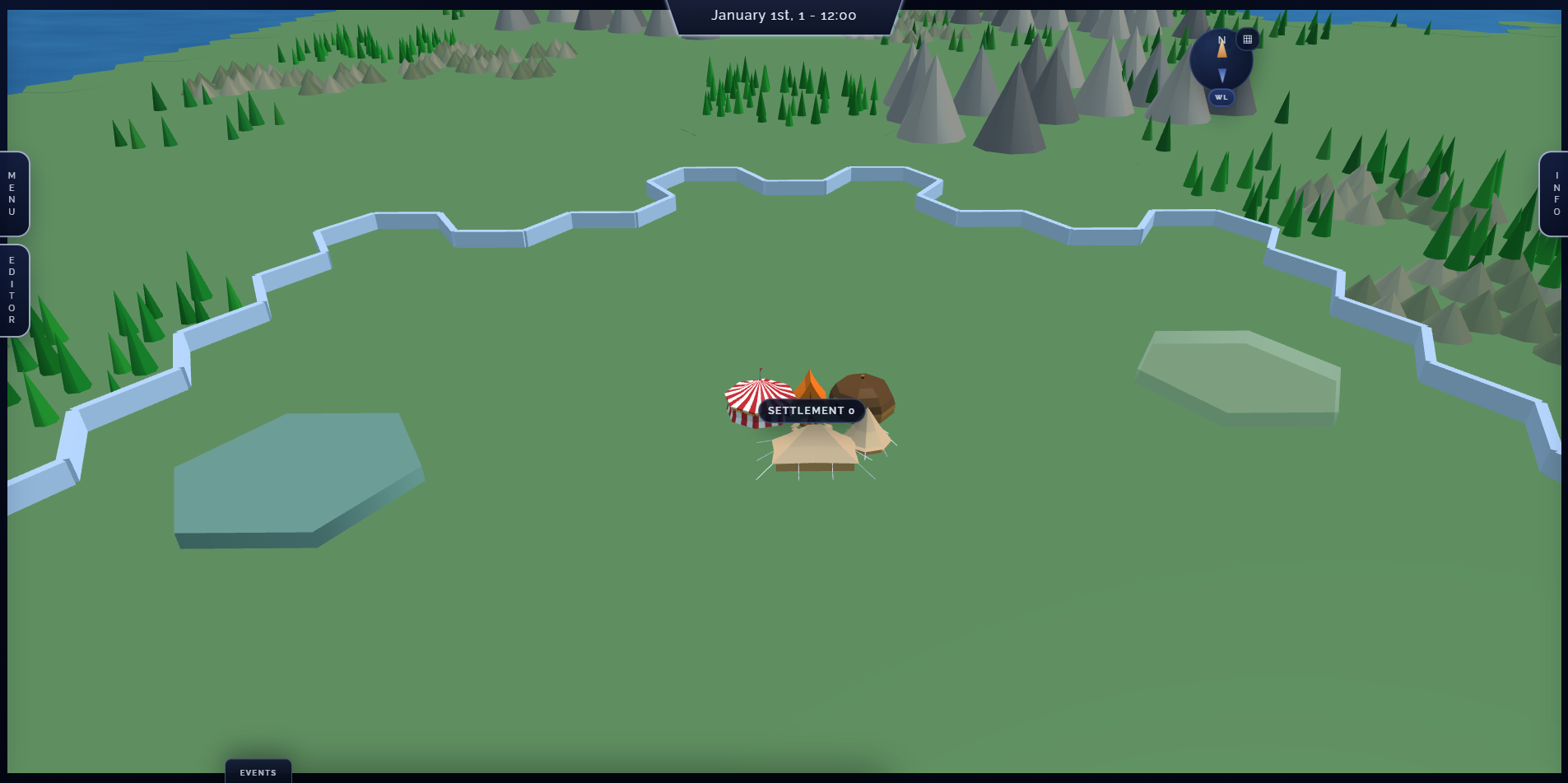 I have implemented trees, hills, and mountains on the world map, as well as facilities for each settlement developed zone.I am working now on having imposters instead of meshes.Simulation is working fine. We can spawn multiple characters with their own world bands going around, getting food, and selling it at the settlement. They also have schedules so they rest for a bit and then go back to work or leisure.