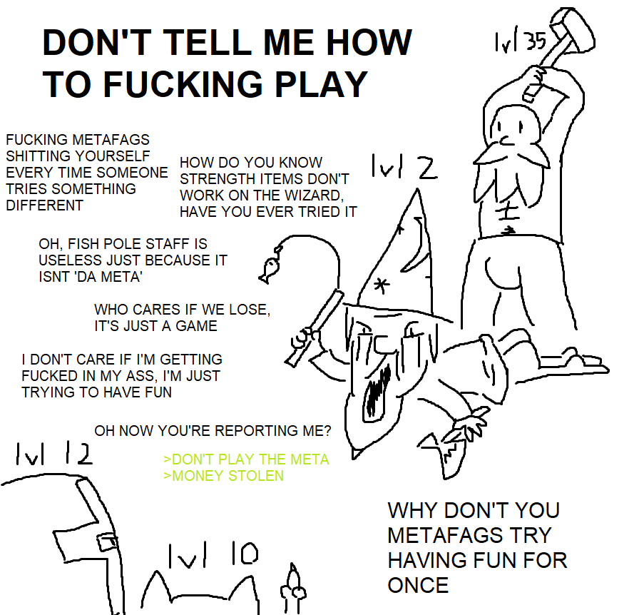 Almost everyone misses the point of that image. The people "telling him how to play" aren't even metafagging. Saying that a strength item does literally nothing on a character that uses INT for damage in this hypothetical game is not metafagging, it's just basic game mechanics, but the wizard reddit fag immediately invents the worst possible person when anyone points out how retarded he is being. The wizard essentially has no items but is calling it a "build". The hypothetical here is not an off-meta player it's someone that doesn't understand the game at all getting mad when people point out the most basic things about how it works. When this happens in games the "meta assholes" usually start by just trying to give basic advice or ask if the player needs help because it looks like someone that picked up the game for the first time 5 minutes ago, then the shitter explodes on everyone and runs back to their favorite site afterwards to write a blog about how toxic everyone was to them.