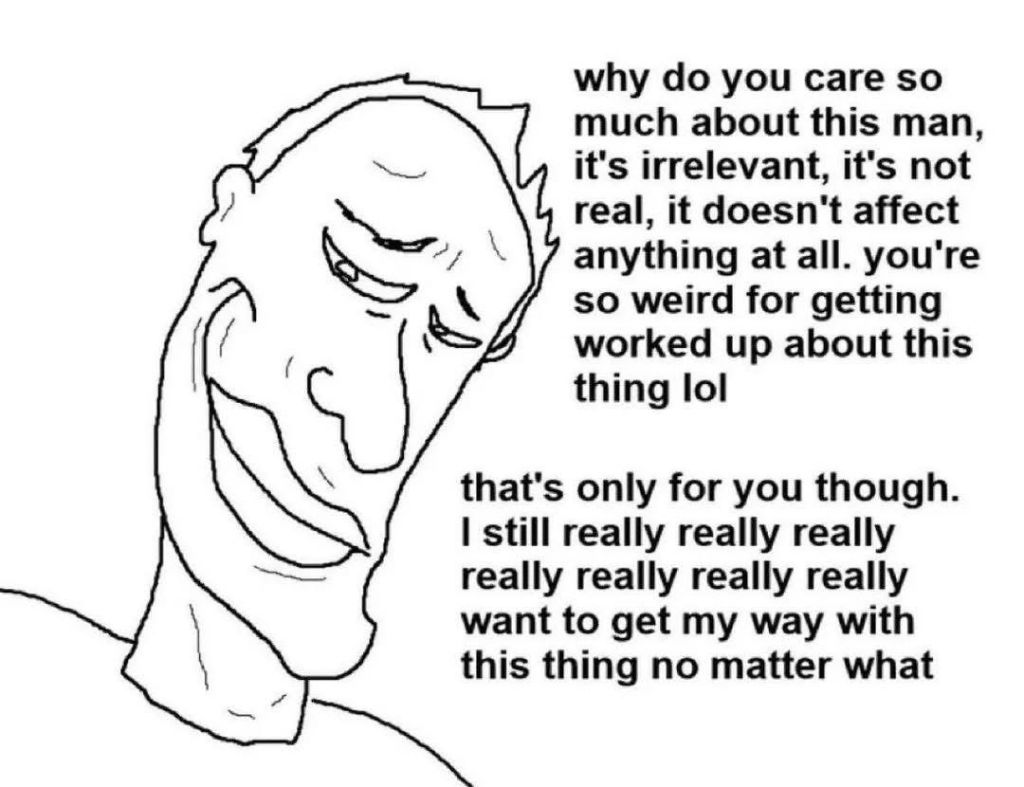 >>737437603>>737438132Something else to consider is that the transgender brazillian who made that picture unironically resorts to using the nanny state admins as a means of punishing retards for not understanding the game. They may be retards, but the mere sentiment of going "Government, help!" over such concerns is repulsive, so it gives further reason to believe those using this image are disingenuous scum.