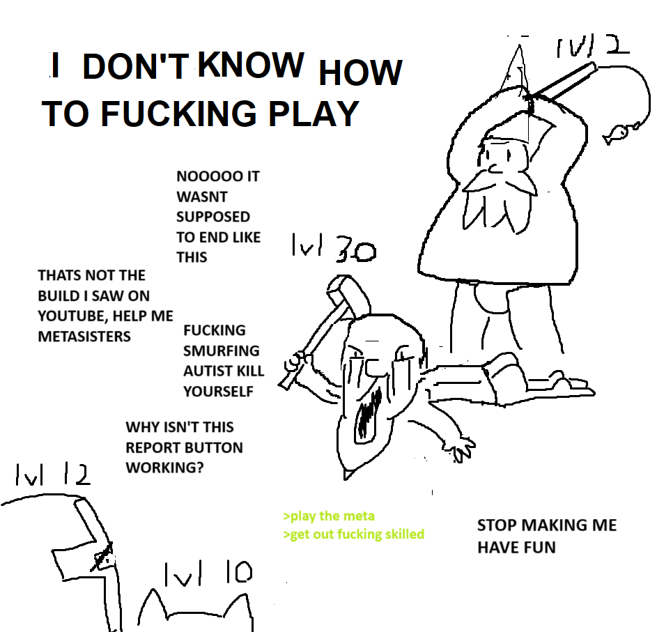 metafags are dullards at worst but i've seen it personally that the worst for-funfags will call for your family to get skinned alive if you just whisper that they're being a touch ineffectivewhats important is that you are willing to experiment and figure things out on your own while learning from mistakes, instead of just copying everything you see online or disregarding the people you play with. a lot of speedrunners miss out on things because they don't experiment and most for-funfags don't realize that the game is more satisfying when they win more when they finally find the solution to their terminal loss problem