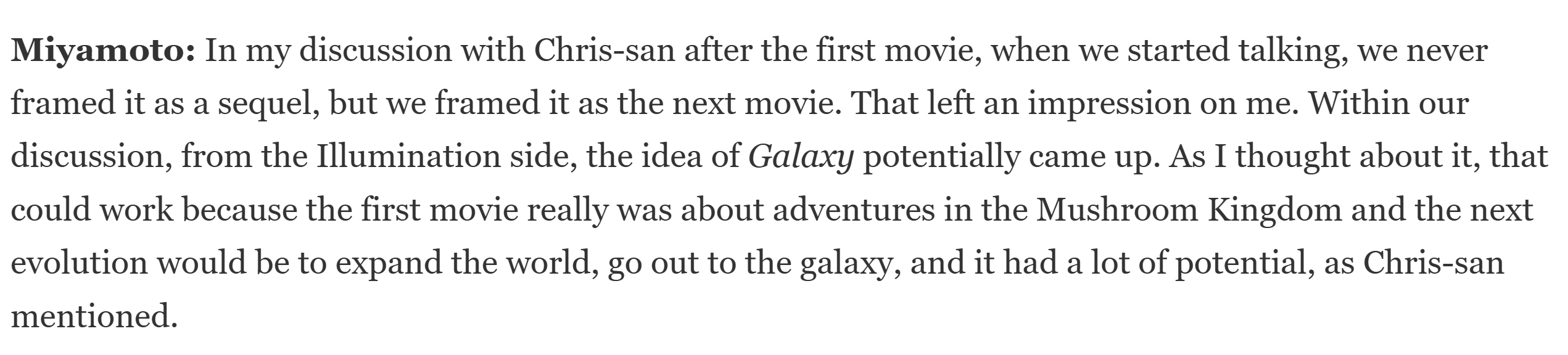 >>737437791> the Illumination CEO basically explains that he had to TRICK Miyamoto into letting him make a sequel. That Miyamoto wouldn't approve of the whole thing unless it was some kind of completely self-contained in-a-vacuum story that just happens to still be Mario-related. I'm not seeing that in the interview at all>Miyamoto explains it, he truly believes that Mario Galaxy turned out to be a continuation of the first movie purely because of coincidence. And that it's simply something that "resembles" a sequel.this im seeing though