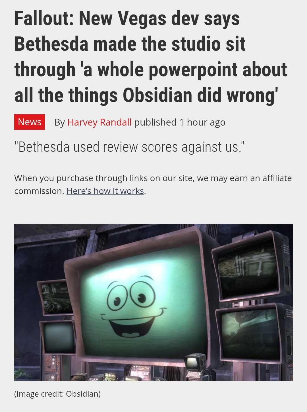 >But it's a matter of public record that Obsidian wasn't brought on for further projects—which, according to writer on the game and prolific videogame narrative guy Chris Avellone, was something Bethesda really hammered home.>And while TKs-Mantis tries to brush these concerns aside, Avellone insists that "when it comes to sales and reviews it matters—and also Bethesda used review scores against us for the DLCs for, like, why they didn't want to keep doing things with us anyway. Even though they didn't wanna keep doing things with us anyway. So whatever.">According to Avellone, Bethesda raked Obsidian over the coals with slides."It was fun, it was fun—they had a whole powerpoint. Not even about the DLC, they had a whole powerpoint about all the things Obsidian did wrong, and we were like 'wow!' and they showed it to us. And we were like… 'okay'. This is hugely morale-boosting.">He continues: "I thought we [made] a good product for you guys that kept Fallout in the public consciousness, but you guys don't seem very happy about it despite the fact you reaped a lot of the rewards for it."Will the cringe PowerPoint slides ever see the light of day? I wonder what were in those slides; perhaps a complaint about the lack of diversity or how the game was just too complex for the normies to understand? That it didn't handhold the player like modern game studios do today? I doubt it was about the bugs; you don't throw stones in glass houses.