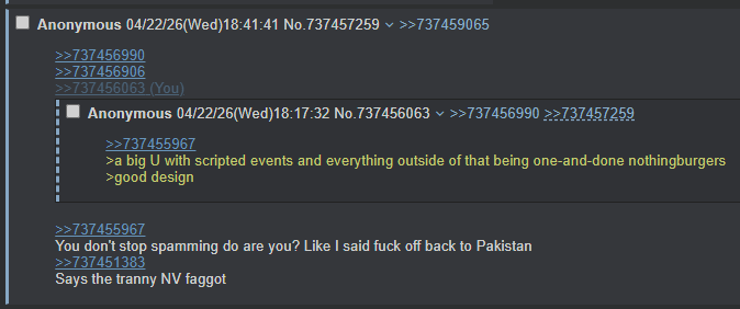 >>737456990>>737456906>>737456063>>737455967You don't stop spamming do are you? Like I said fuck off back to Pakistan>>737451383Says the tranny NV faggot