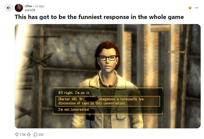 Anytime one of you faggots want to critique the writing of this game you always pic some random NPC and never actually go for the story. Meanwhile nothing has beaten the “use the radio” intelligence check in stupidity.