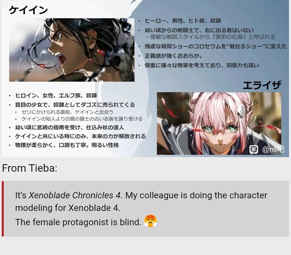 >>737497524>>737497530Of course it’s real, Mai Yoneyama was leaked to be the artist and character designer of the next new Xenoblade game back in 2024; and then we got the leak which clearly uses her art style instead of SaitoM’s even though a fake AI-generated leak would use SaitoM’s art style as the basis, AND has the main character be another obvious Fei expy, these are the biggest signs that the leak was real
