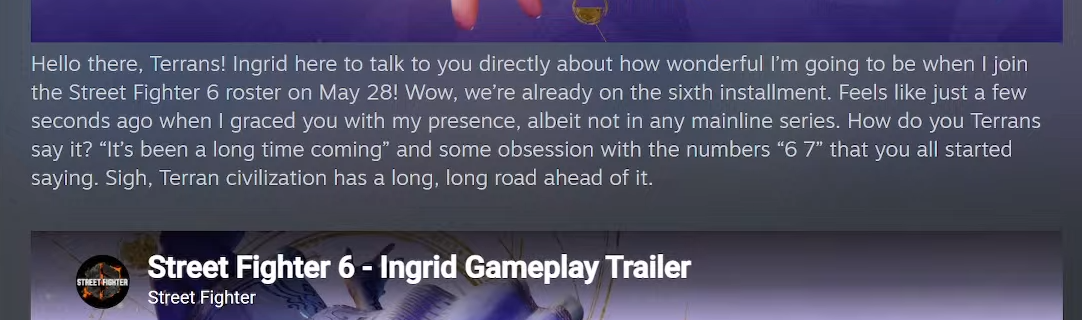 >>737460189It's such a weird response to have because my only complaint is Ingrid looks fucking insufferable to fight. I mean look I'm not really "good" at SF6 (Plat with a couple characters like Gief and Ryu) so I know my complaints might just be Johns. But still just looking at her trailer I just feel like I'm gonna spend more time getting mad about playing against Ingrid than anything so I don't want to lel.