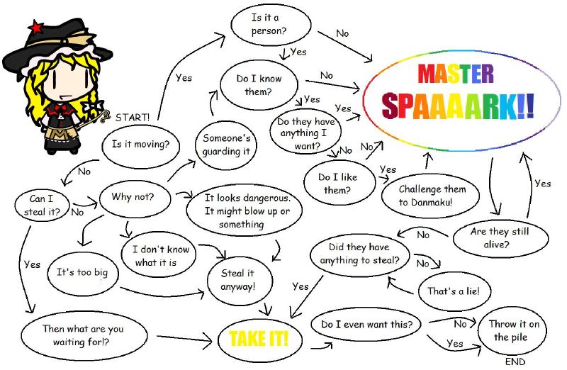 >>737476207>if Steal; When Wanted Keep Else: Toss it.>If moving?: Master Spark. Else: Repeat.Basically. Too many words, feels like a leftist meme. At least Ken flowchart makes sense to be a flowchart.