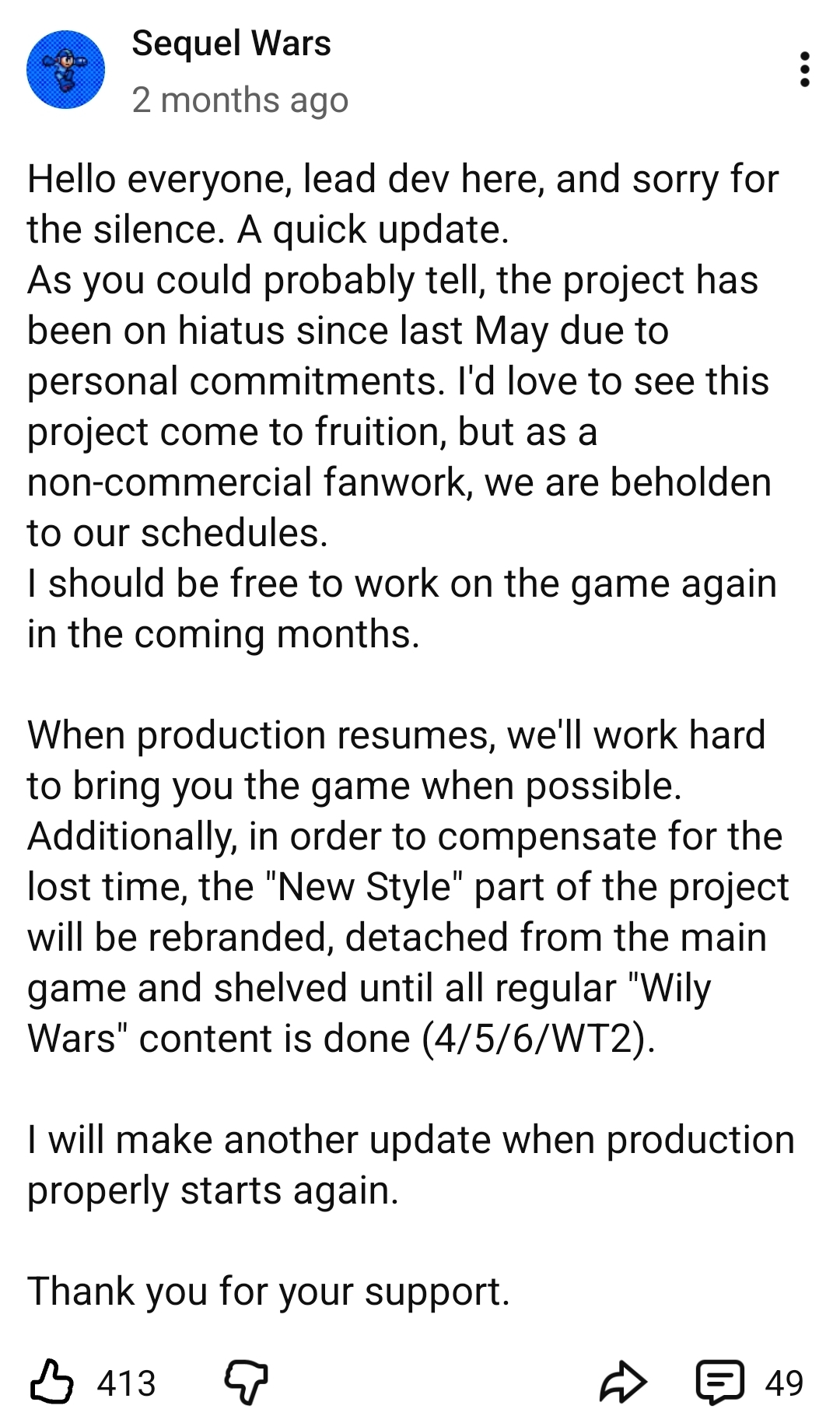 >>737472290I took a quick look at their page and apparently they posted an update. They're canning the 7 style remake (for now) and sticking to Wily Wars styled remakes once development resumes. Thank Christ. What an awful decision it was to do that in the first place.