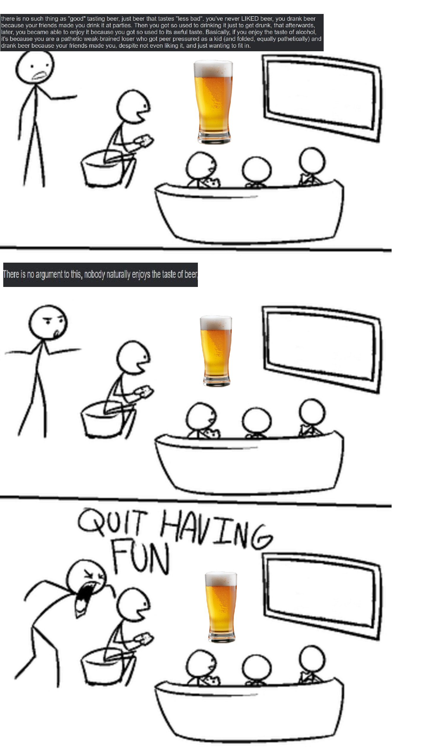 >>737501020This comic really is a masterclass in triggering socialslaves.They absolutely hate being told this.Like if someone claims I don't really like video games as much as I do cuz they're just addictive I'd say yeah maybe w/eBut man when a socialslave gets told he doesn't actually like beer and it's just a social thing, he goes balistic. Just look at this thread lmao