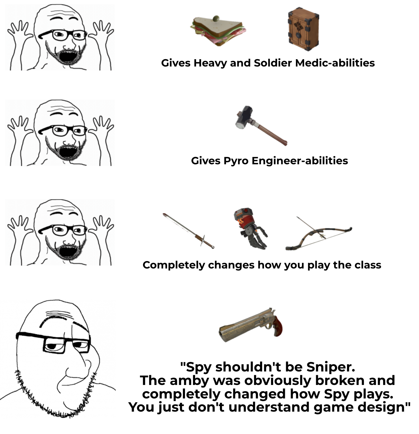 >>737512937>class where half the point is you die if your scheme is foiled>"let's give him a get-out-of-jail-free card">bonus points for the way said get-out-of-jail-free card stacks with the spycicle to dodge even the one thing that could stop the dead ringer from getting you out of jail free (a particularly persistent pyro)I would gladly suffer a thousand spypers on the battlements of 2fort if it meant never having to chase down fucking Dr. Enforcicle ever again.