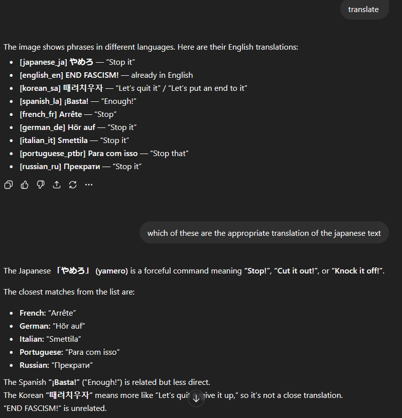 >>737530305>[japanese_ja] やめろ>[english_en] END FASCISM!>[korean_sa] 때려치우자>[spanish_la] ¡Basta!>[french_fr] Arrête>[german_de] Hör auf>[italian_it] Smettila>[portuguese_ptbr] Para com isso>[russian_ru] Пpeкpaти Wew.
