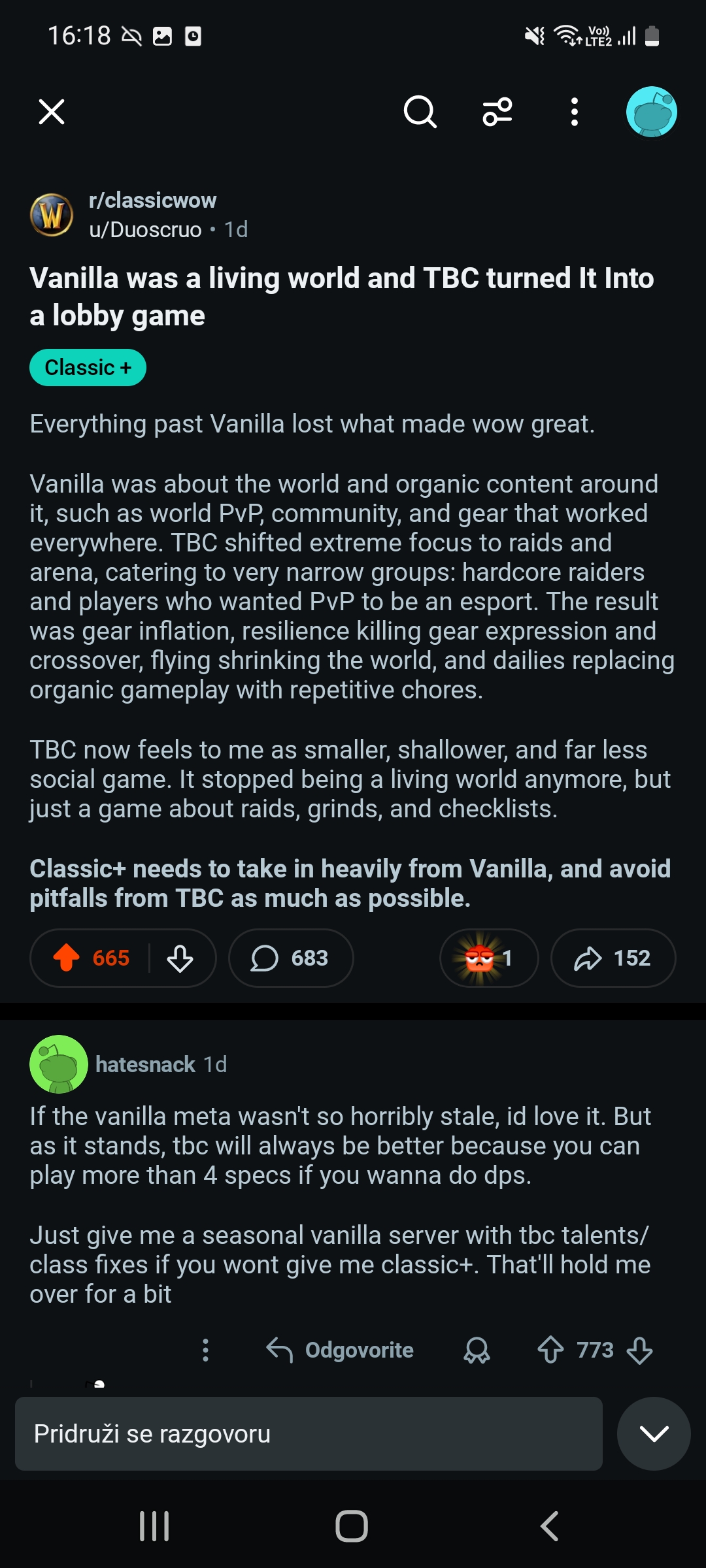>>737555185I'm playing TBC Classic for the first time now. I played TBC back in 2006, but I was a stupid kid and I don't think I got all that far.I like it so far, but I genuinely dread reaching level 60 and engaging with the actual TBC content. I'm just liking levelling with all the new talents, the tons of new quests added to levelling zones (a part about TBC I had totally forgotten) level 30 mounts, etc. The vanilla game is just so much smoother now.But actual TBC content (60+) does suck. I hope Classic+ is at its core just vanilla with class adjustments, because in Vanilla like 70% of specs are meme-tier.People want more raid tiers in Classic+, but fuck that, that's just a return to the "seasonal game" problem that the game already has, where there's massive population spikes on releases but otherwise it's dead. I want a "forever home" again.