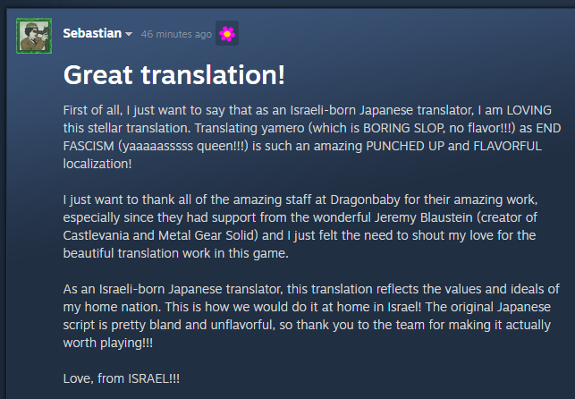 >>737566398The funny thing is there was already an uproar over the demo's skibidiy rizz translations and the devs took those lines out but then it turns out the full game is completely butchered. I think they got scammed.
