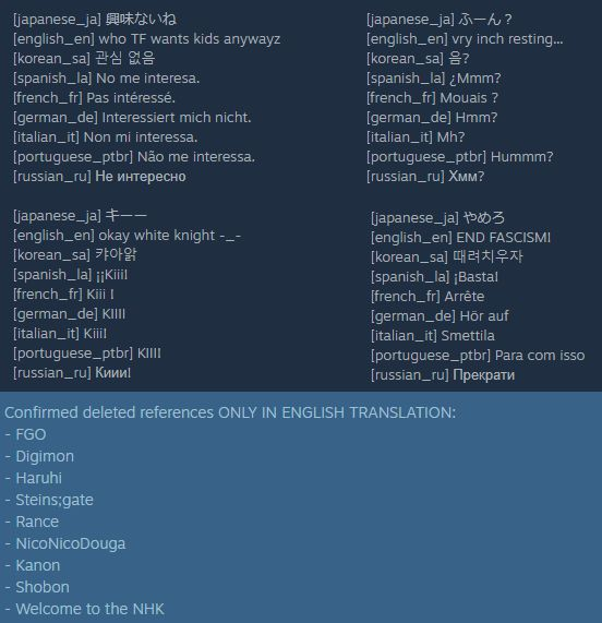 >>737563925I went to steam and found this review.>The line "Yamero" (literal translation: "stop" or "stop it") has been replaced with "END FASCISM!",>The line "Ryō noroi de shibaranaikara" (literal translation: "I won't bind you with a Command Spell") has been replaced with "i will NEVER be victimized under fascism again", and the line "Iranai" (literal translation: "I don't need it") has been replaced with "i'd cut my uterus out if i cld".