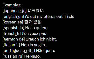 >>737562996[japanese_ja] いらない[english_en] i'd cut my uterus out if i cld[korean_sa] 필요 없음[spanish_la] No lo quiero.[french_fr] J'en veux pas[german_de] Brauch ich nicht.[italian_it] Non lo voglio.[portuguese_ptbr] Não quero[russian_ru] He нaдo.