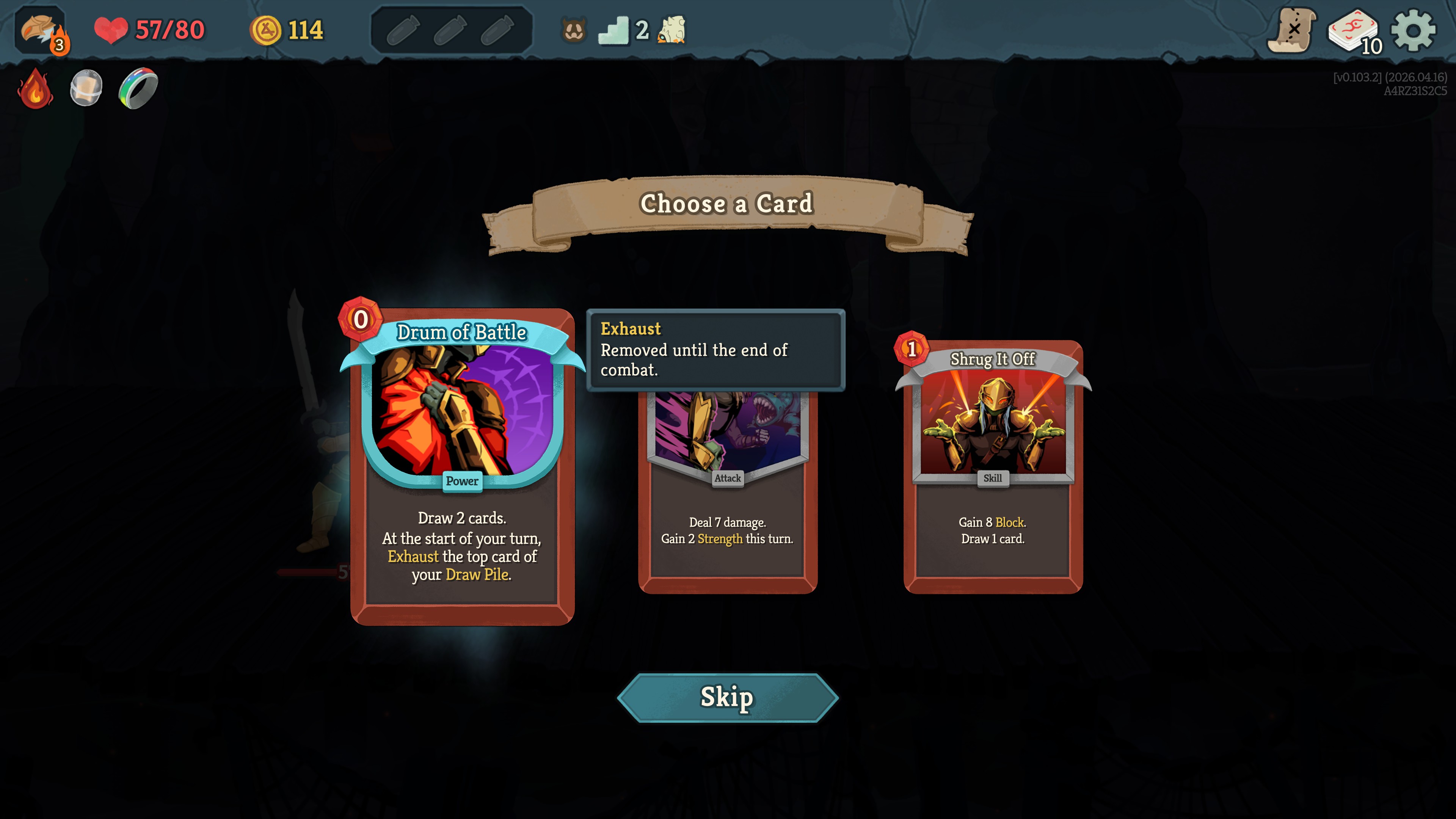 >>737570810alright, let's see if it pays off, was almost ready to call it quits, since I unlocked the relic that damages enemies when you exhaust...but I dunno, exhausting a card every turn, would I really benefit from it?I am tempted to get it for shit and giggles but I don't know where to go from there.