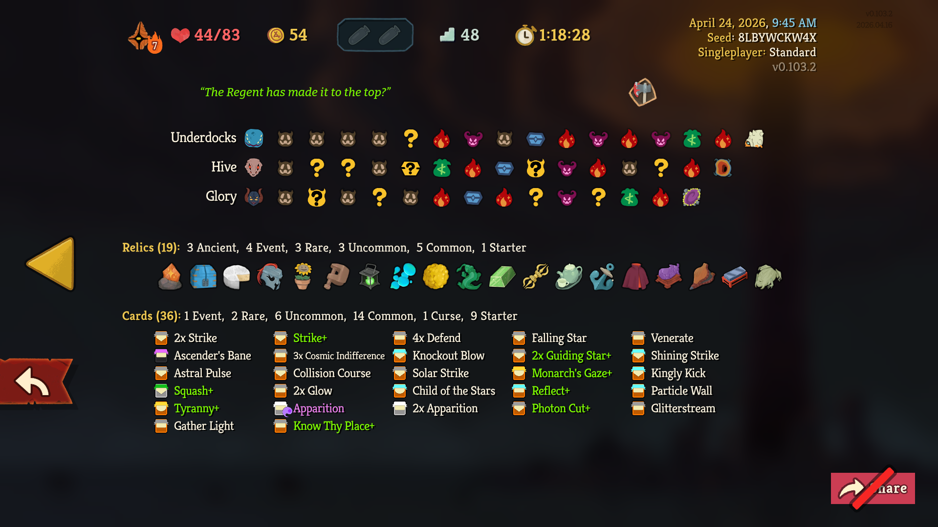 haven't played in a while, came back and eventually got this regent run. Forge still seems slow and punishing. Stars are still difficult to manage, you pretty much need to somehow order your cards so you don't get your spenders before you generators, or you can get fucked by RNG. In my case i had Shining Strike, 3 Cosmic Indifferences, and also Tyranny+ helped. Relics that were broken (as always):Chosen Cheese, Sturdy Clamp, Lantern + Pael's Tears.The new doormaker boss seems like the hardest, not sure how anybody dies to the other bosses...So overall not much different than before the patch.