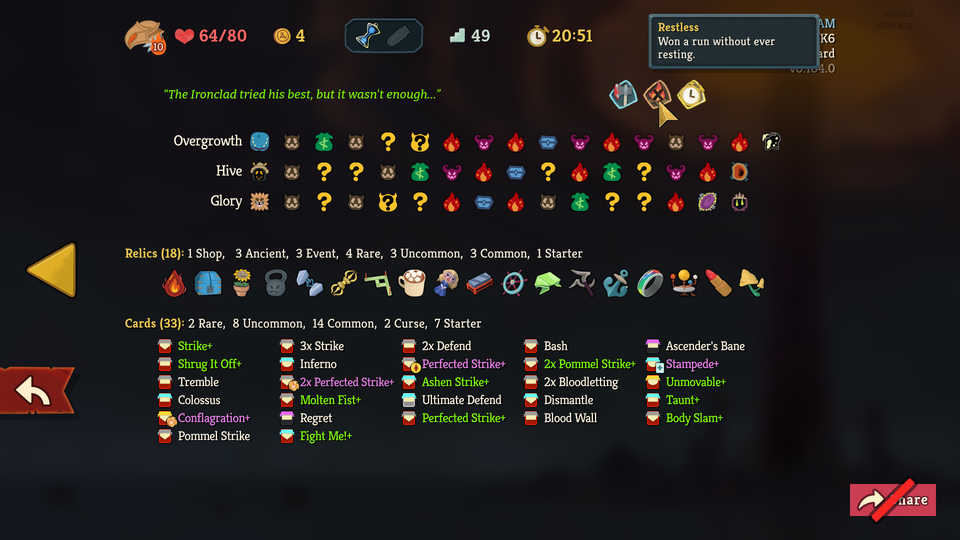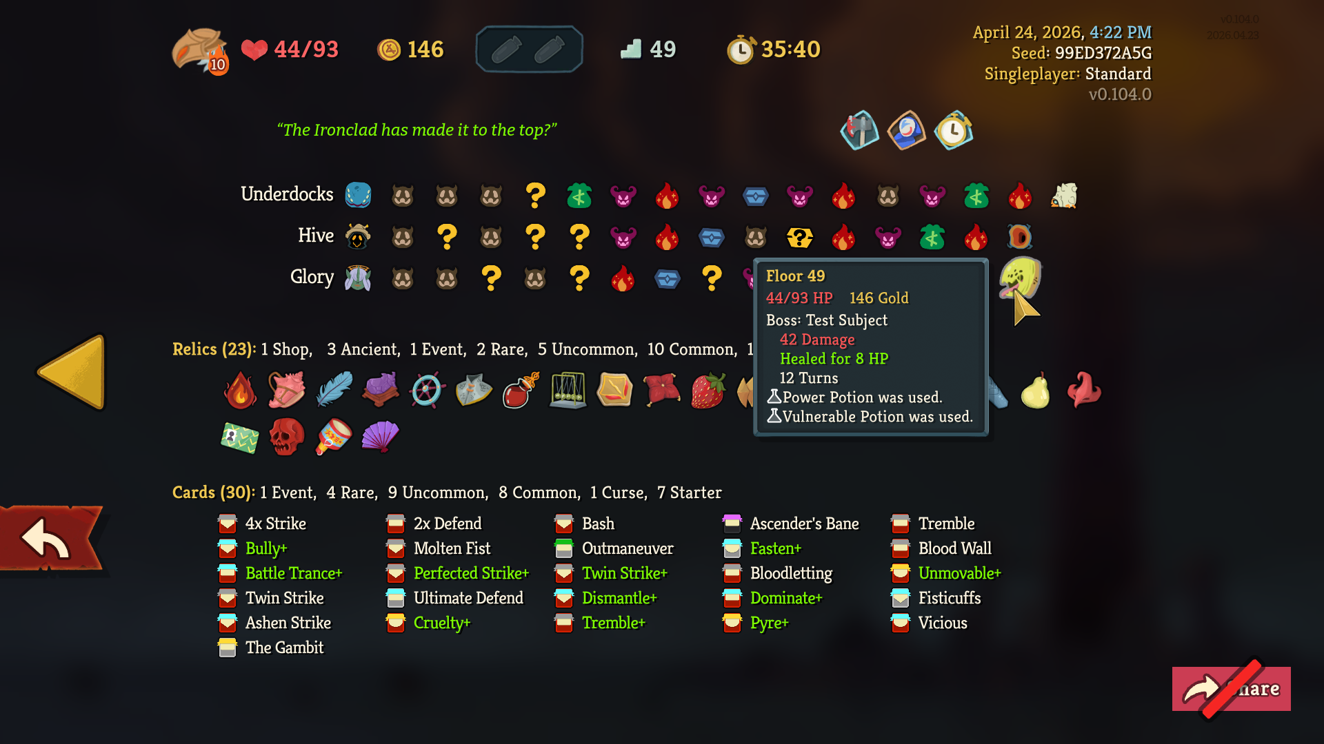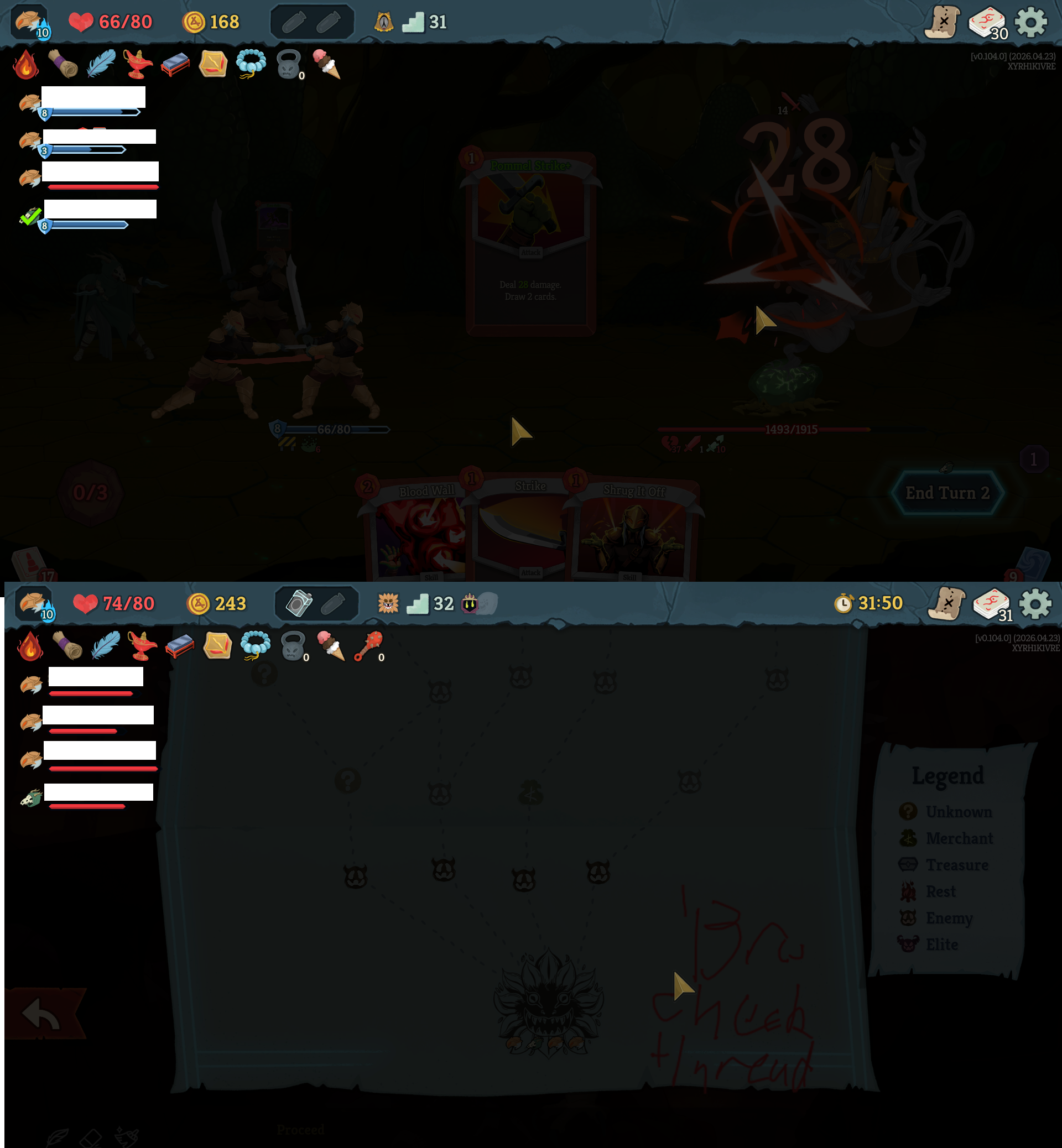 >>737608524GGs very funny run lads. Triple Ironclad off random, with a dominate offered to me as the first card reward, meant I could scale off the vuln to the moon. Bully with Instinct is perfection.>>737608941Yeah I guess that's a fair sentiment, but I will say 4 people multiplayer is much easier than solo. (Also the multiplayer ascensions are unlocked separately from solo.)