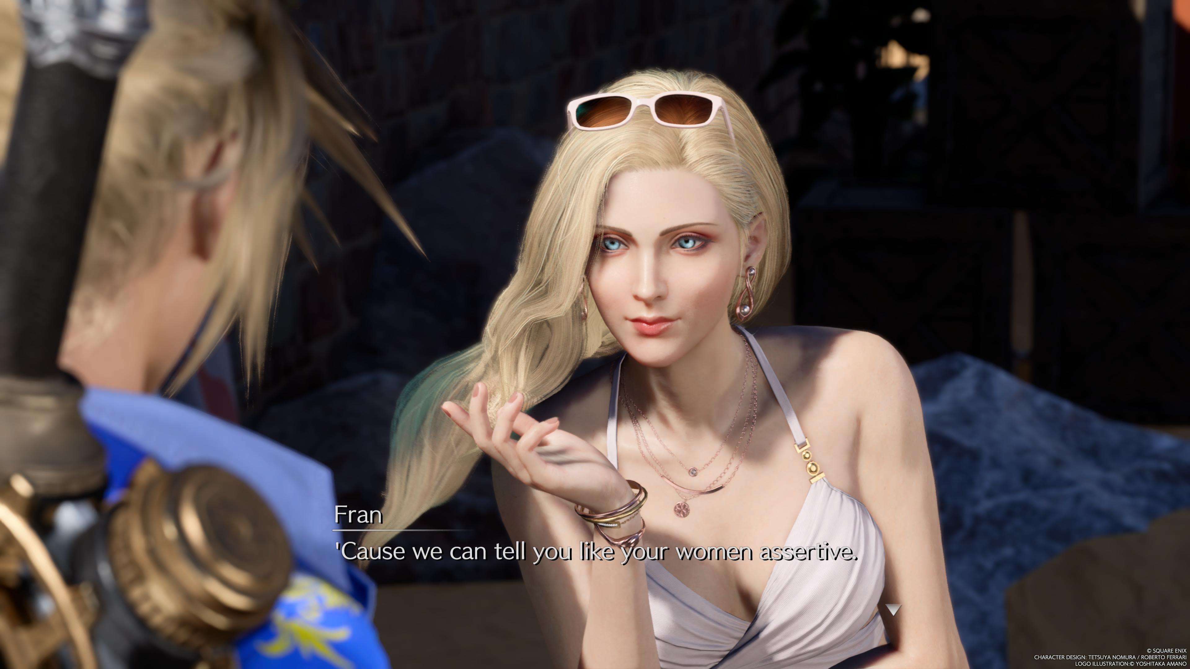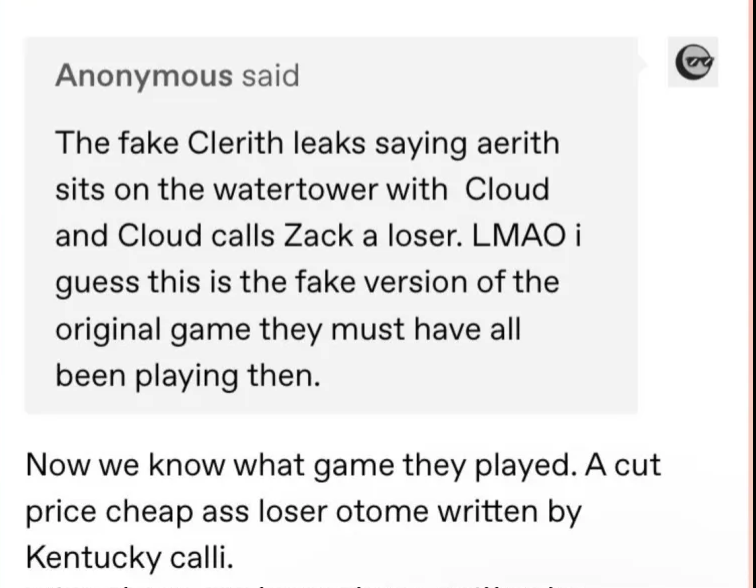 I'm not a fan of shipping, but every time I see something with Aerith I always see some paint huffer logic that makes no sense for her to be with Cloud. Tifa and Cloud have the Highwind scene since the OG and have a family afterwards. Cloud went off to be a first class soldier for Tifa to notice him. Tifa is the main reason Cloud regains his actual self. In the process of bringing Cloud back, we see how he's pretty much obsessed with Tifa. Rebirth even gives us plenty of scenes showing how much of a simp Cloud is over Tifa while he always grimaces when Aerith throws herself at him. How does Cloud end up with Aerith in part 3 after all this? All the evidence I see for the ship are quotes from old excerpts 2 decades ago and mental gymnastics without a drop of thought. Even if Cloud and Aerith were originally set up to be lovers, that clearly isn't the direction they went to for the og and the remake. If the precedence for shipping was the creators' original ideas, then Aerith and Sephiroth are lovers. Zack was brought back and shippers relegate him to the cuck chair when the creators have said they want the ending to be happy for the characters. The logic I keep seeing for this is Zack is brought back to approve of Cloud and Aerith being together even though she's. There's no logic in that train of thought. Marlene's scene that's always used as proof for Zack being a cuck is placed out of order and ignores that Cloud's date with Aerith has her explaining there's different kinds of "like," the same date that's almost the same as Zack's, but with the NPCs constantly telling them they don't look good together. Rebirth puts it right in your face that their relationship isn't the same as Cloud and Tifa almost kissing, and even having the ferris wheel kiss that's ignored because it's "optional."You shippers have tumors in your brains.