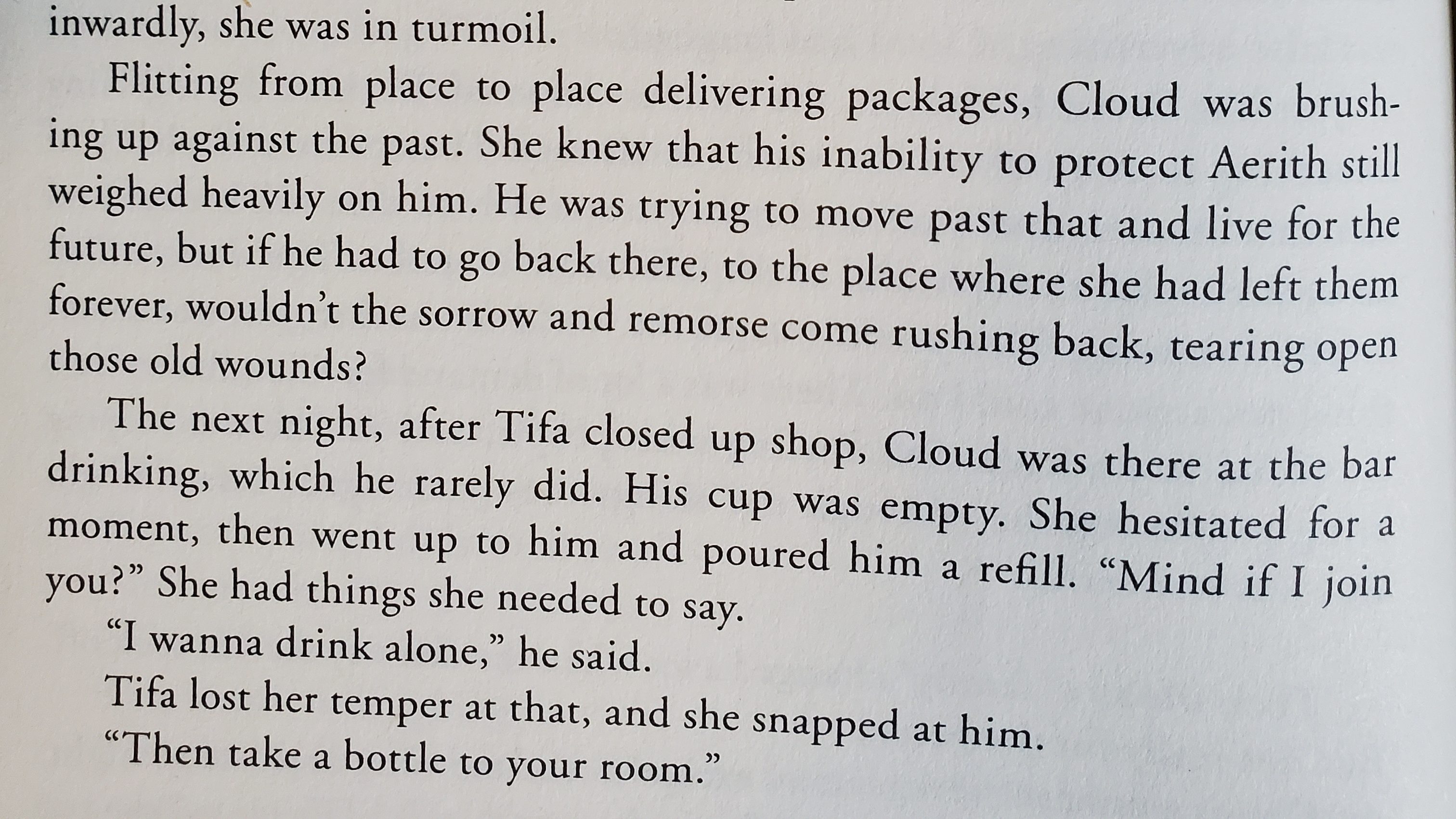 >>737611459You're making it sound like Cloud and Aerith had those dates in earnest and not as Cloud always scowling. How do you gloss over the details but end up reading the novels? What the novel showed was Aerith looking for Zack in everything as well, obsessing over him to make sense of why she even gravitated to Cloud who copied his mannerisms, walk, and the big fucking sword. It's a different relationship with Zack because he's dead and Cloud is the replacement. That's what the ship amounts to even with DD.