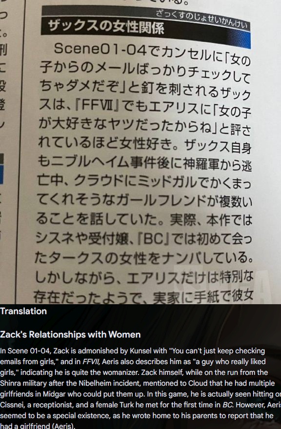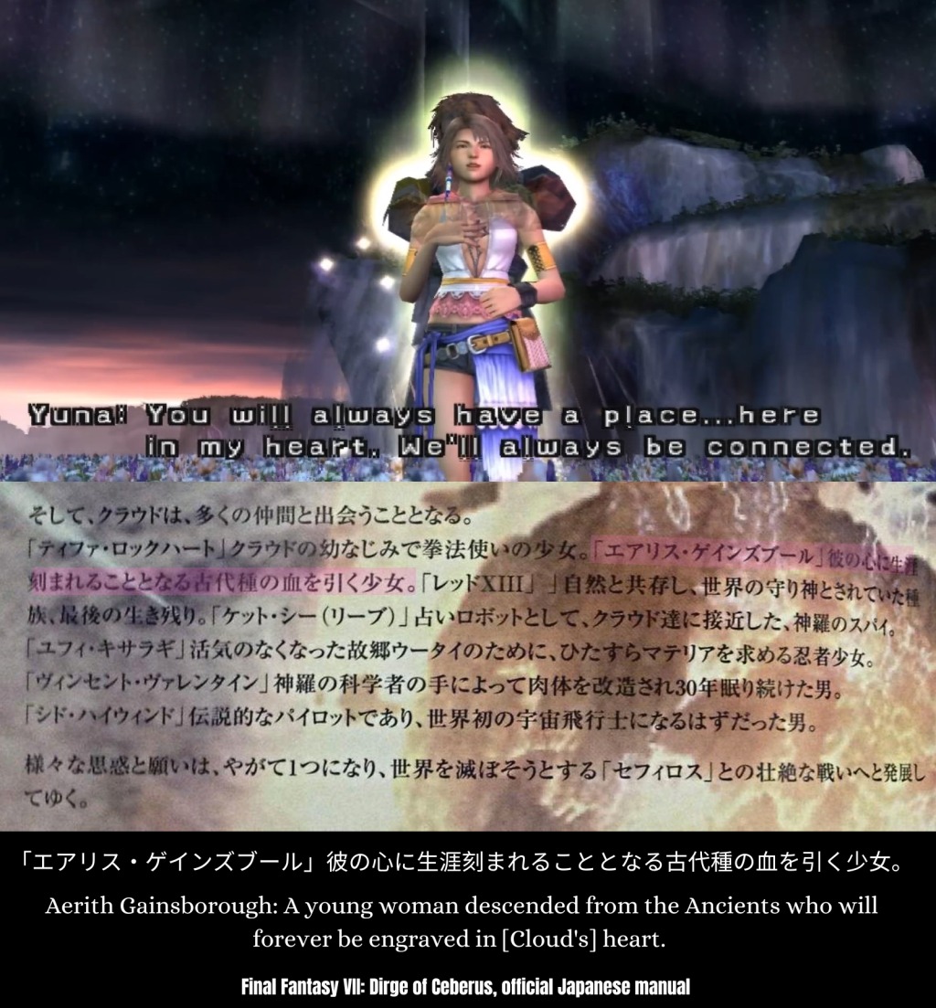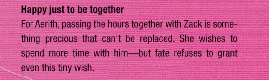 >>737609368AC shows Aerith's main concern is Cloud. The movie shows her and Zack working together almost like business partners out of concern for Cloud. The complementary Lifestream White chapters written AFTER AC and CC show she has zero (0) thoughts in her head about Zack and thinks about Cloud, her lover, all the time. Forgive me for taking into account the character information Nojima wrote.