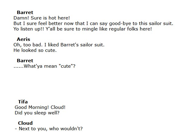 >Aerith calls Barrett cute at the beachDid she and Barrett...?