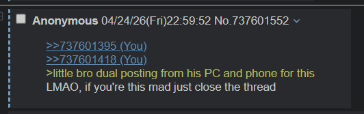 >>737601395>>737601418>little bro dual posting from his PC and phone for thisLMAO, if you're this mad just close the thread