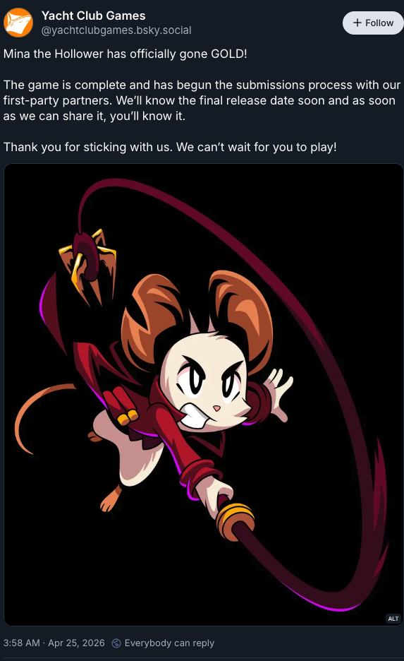 >>737594582It was supposed to come out on Halloween, then it was delayed with no release date, then it finally got a vague release date of Spring 2026. It's now almost May and they're just going Gold, which means either it's going to come out very late in Spring, later than Spring, or they'll just shadow drop it.