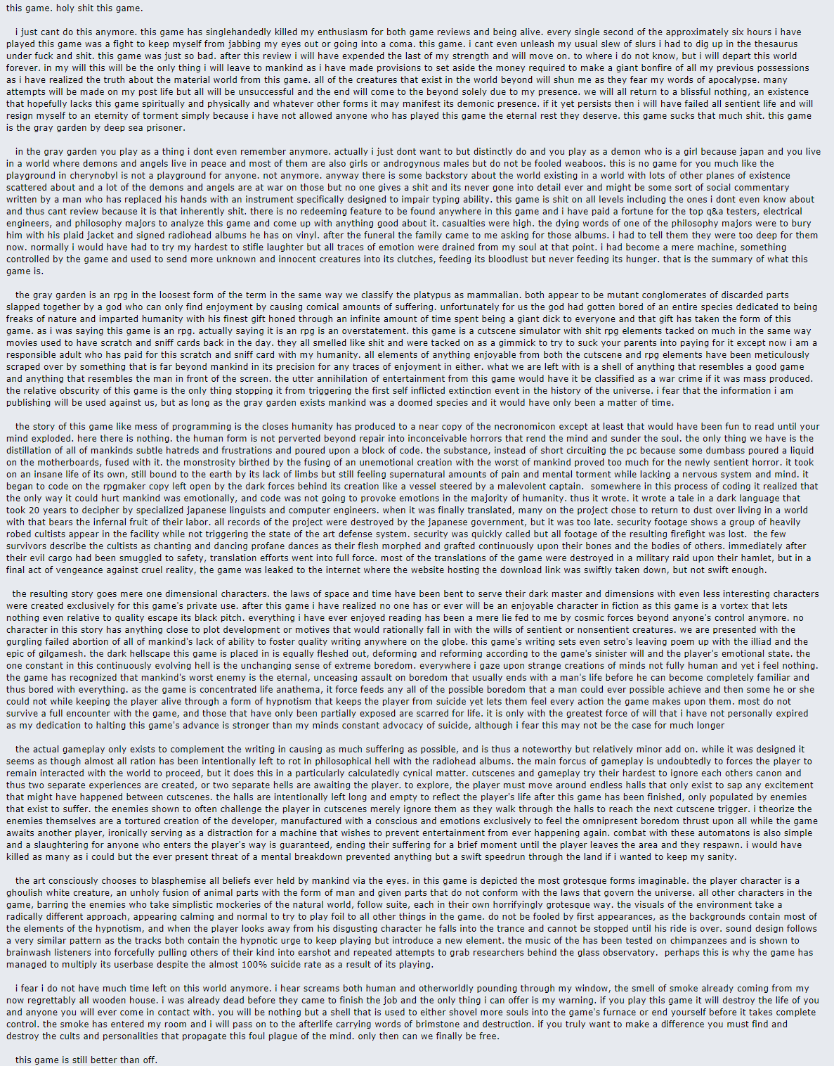 >>737606245The entire last 25% of this game was really something to experience blind, even among all the edgy RPGmaker games of the day it stands out in my memory. I honestly really liked the setting and all the cute characters like that guy with the wife who is just a giant non-anime girl lobster.