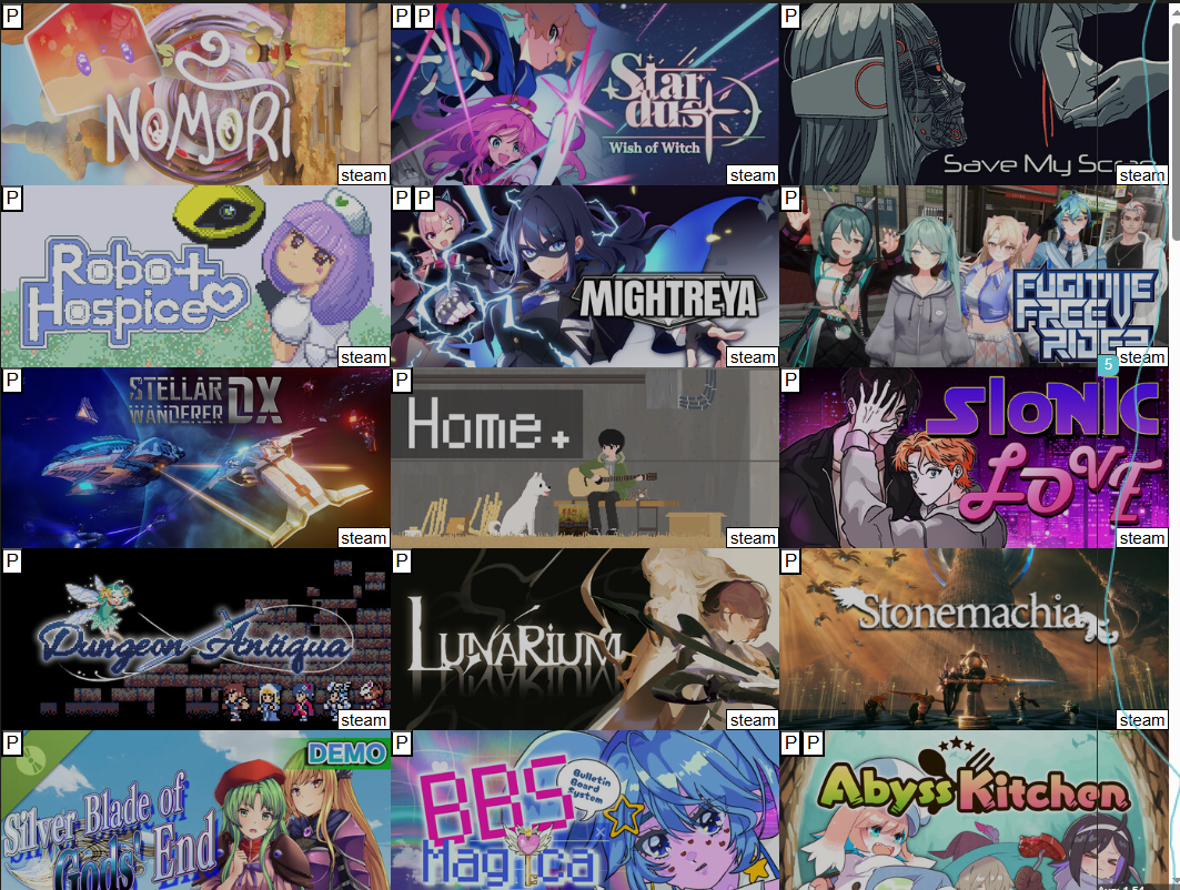 current wishlisted addedhttps://store.steampowered.com/app/4147690/Fugitive_Free_Rider/https://store.steampowered.com/app/3936730/STARDUST_Wish_of_Witch/https://store.steampowered.com/app/1401630/Stellar_Wanderer_DX/https://store.steampowered.com/app/3877090/Home/https://store.steampowered.com/app/4293220/SIONIC_LOVE/https://store.steampowered.com/app/3198540/Dungeon_Antiqua/https://store.steampowered.com/app/2939790/Lunarium/https://store.steampowered.com/app/2982610/Stonemachia/https://store.steampowered.com/app/3667940/Silver_Blade_of_Gods_End_Demo/https://store.steampowered.com/app/3077640/MIGHTREYA/ (added from a previous indie live expo)https://store.steampowered.com/app/3206390/BBS_Bulletin_Board_System_Magica/Also Hanamatsuri and Sakura-iro Tetraprism but I can't find it on steam